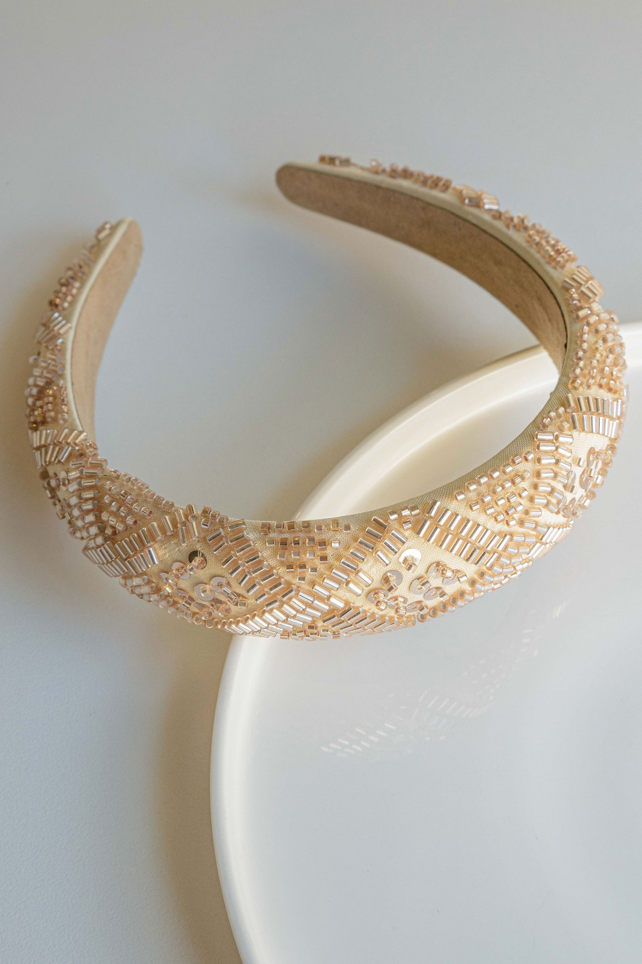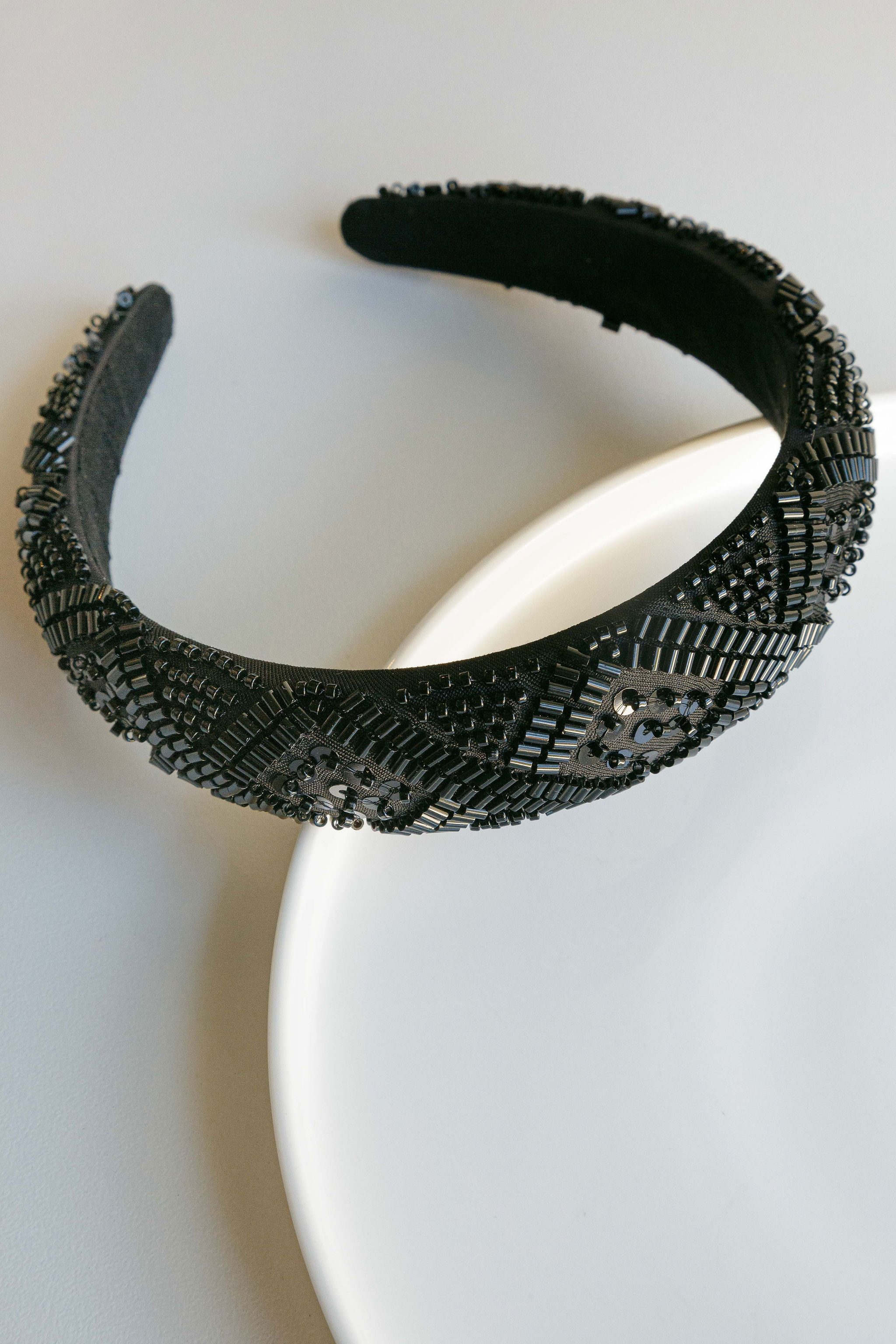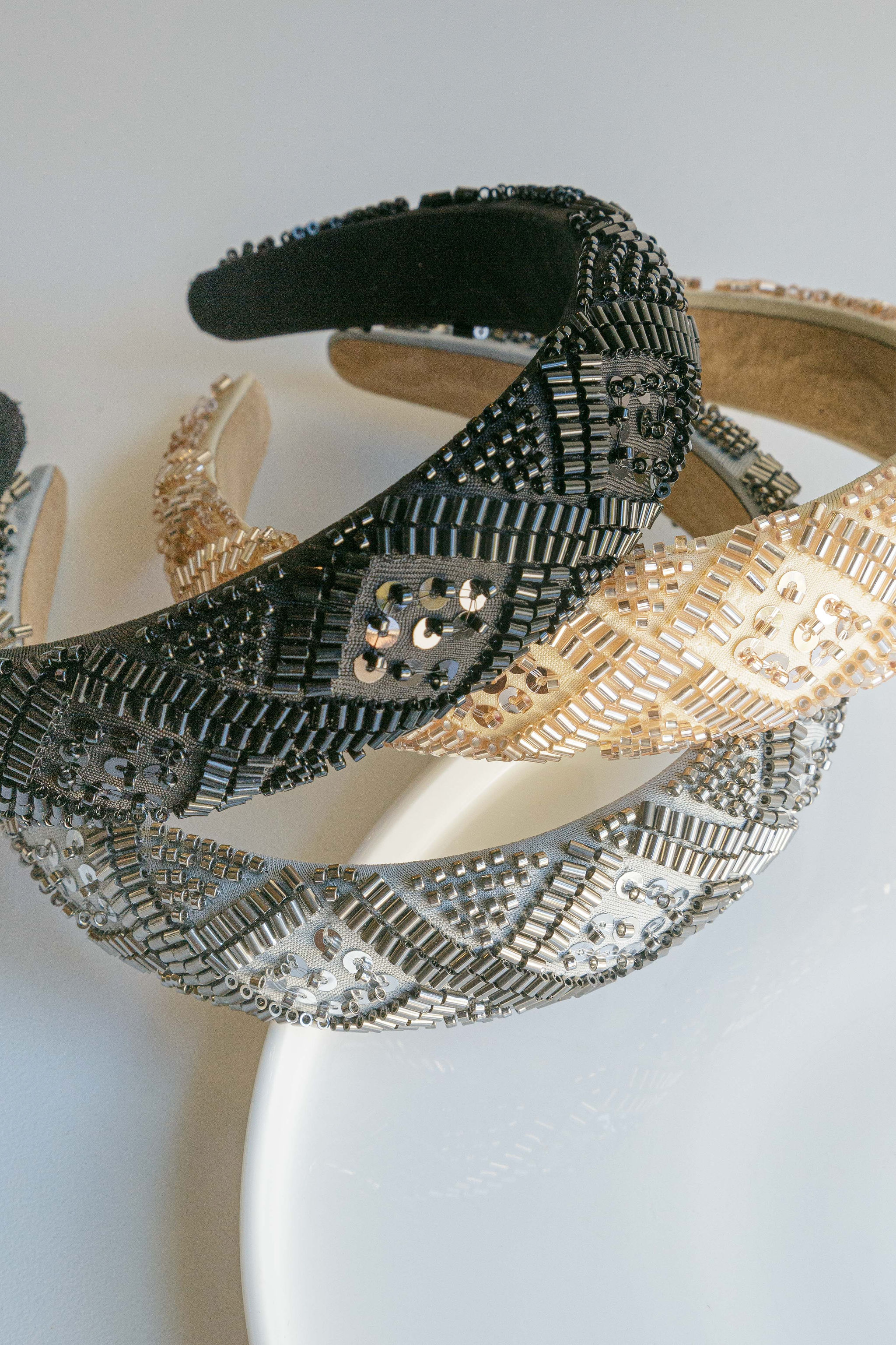 A detailed, beaded alice band. Available in black, grey and nude.