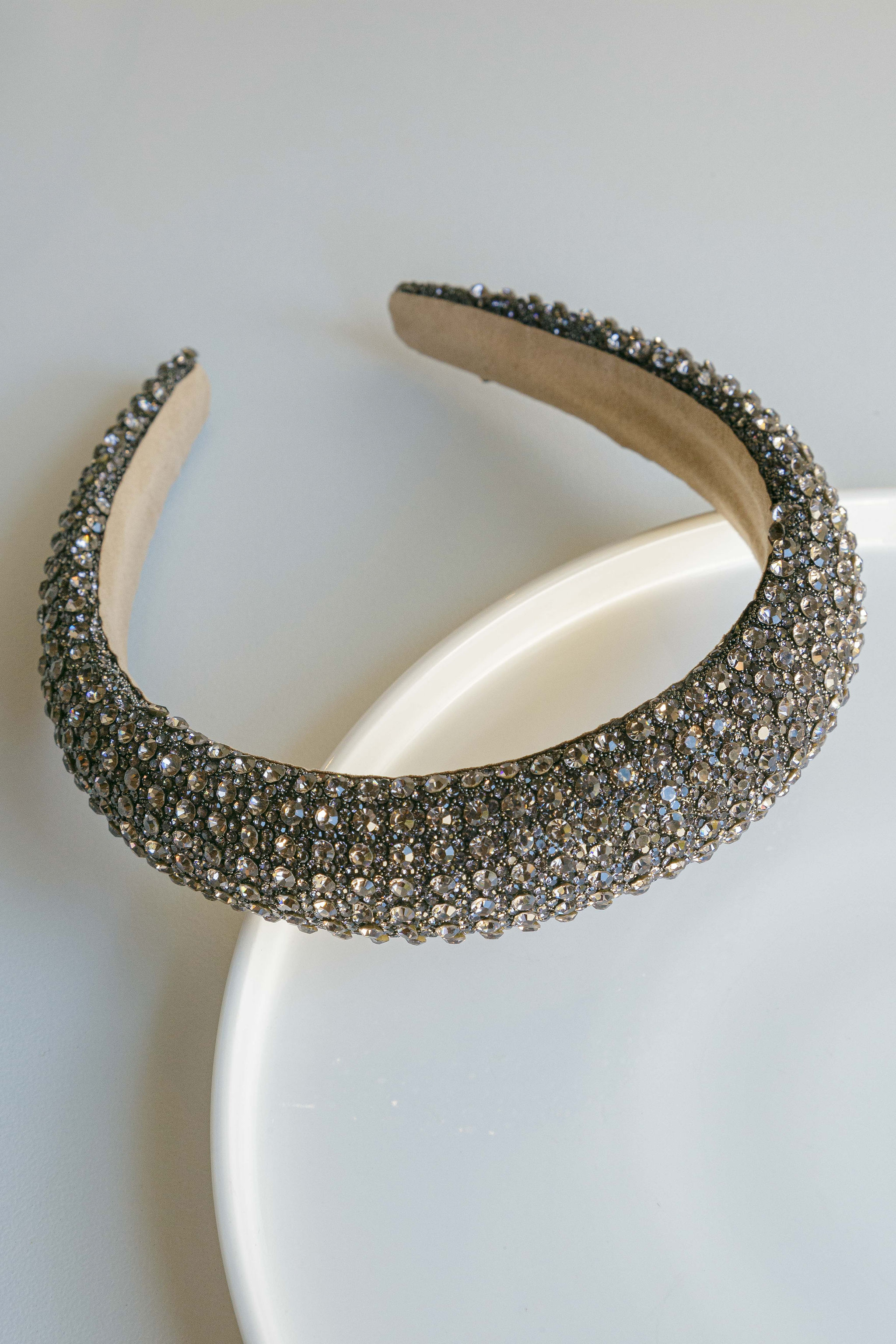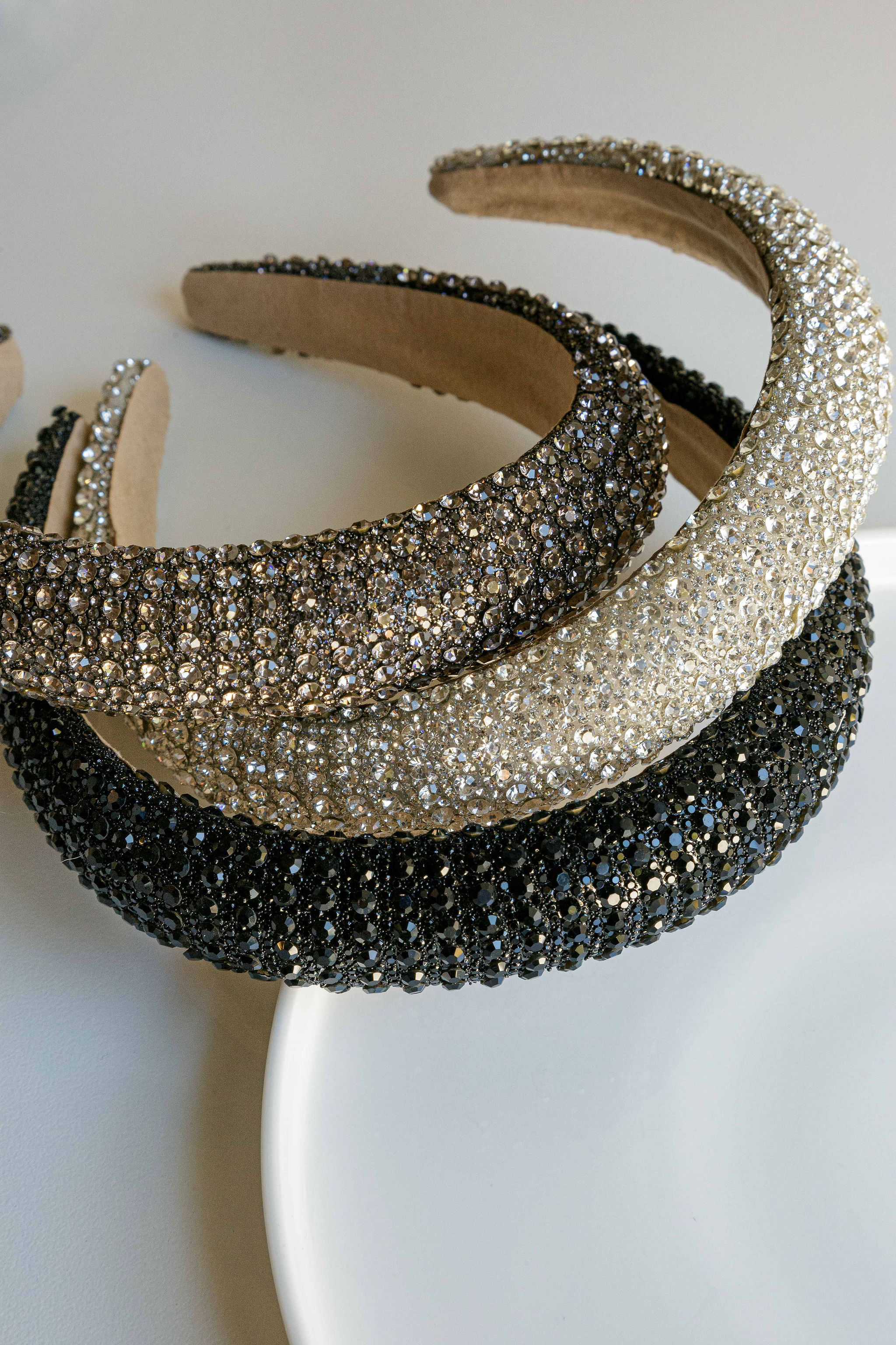 A rhinestone beaded alice band. Available in silver, mauve and black.
