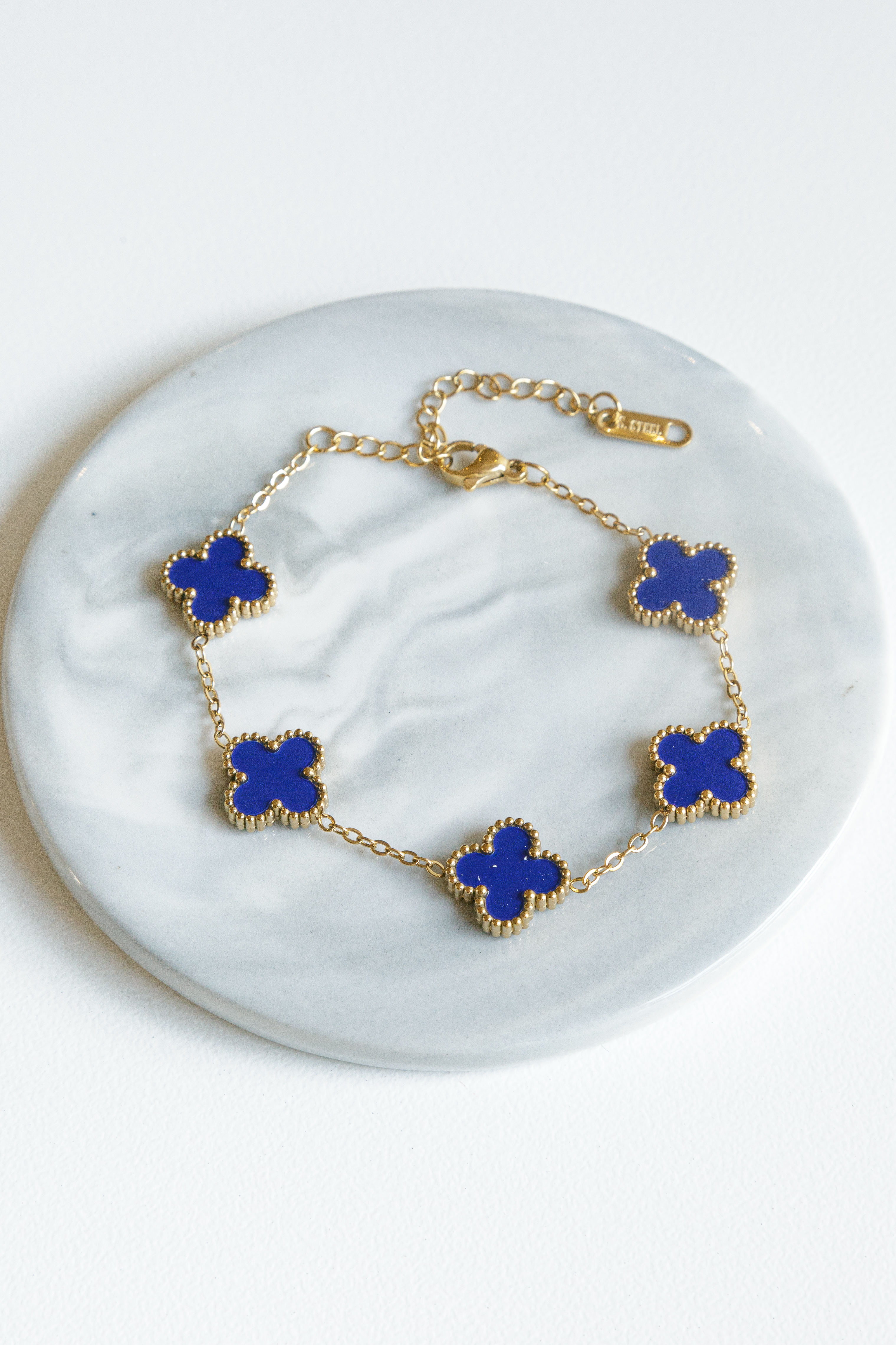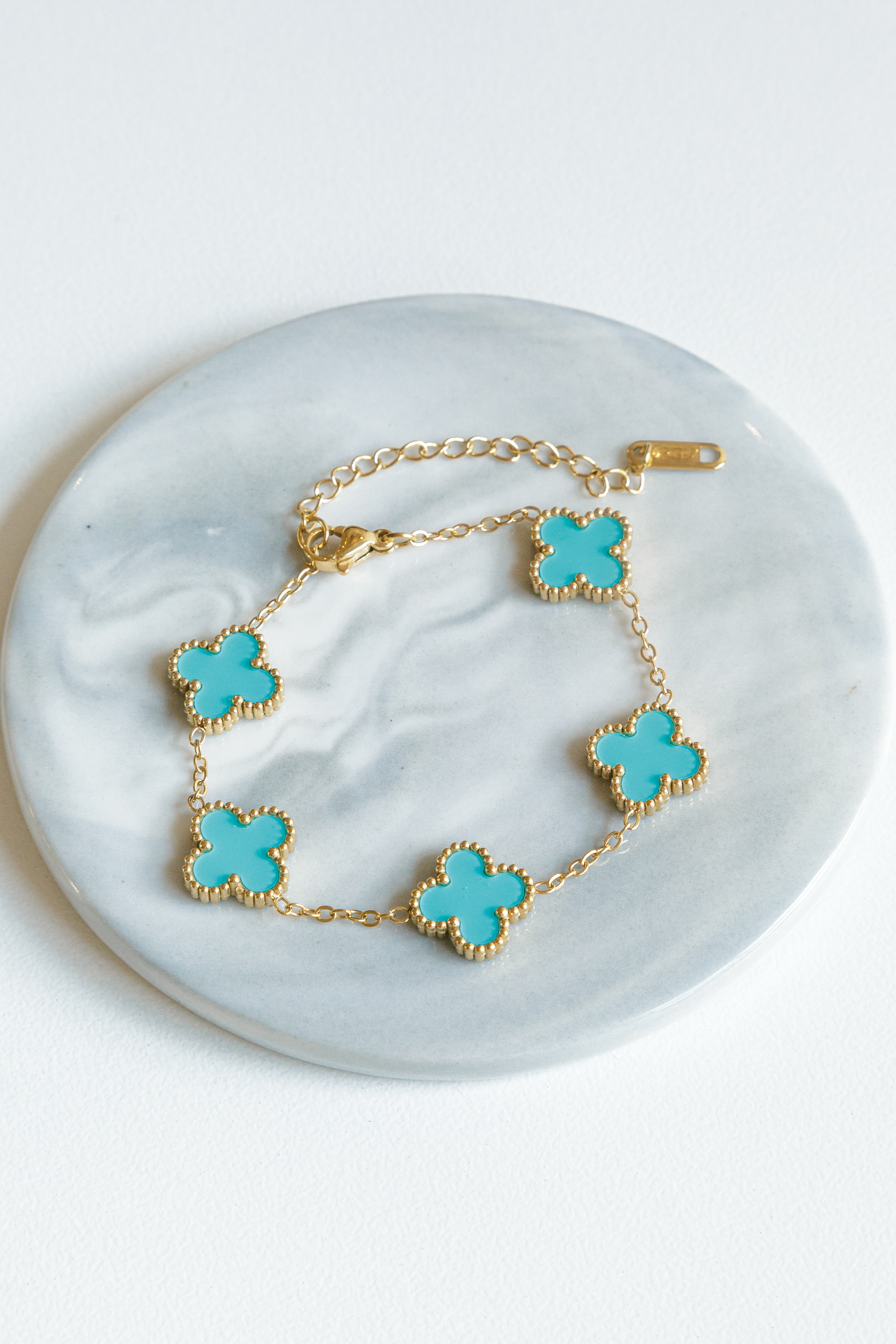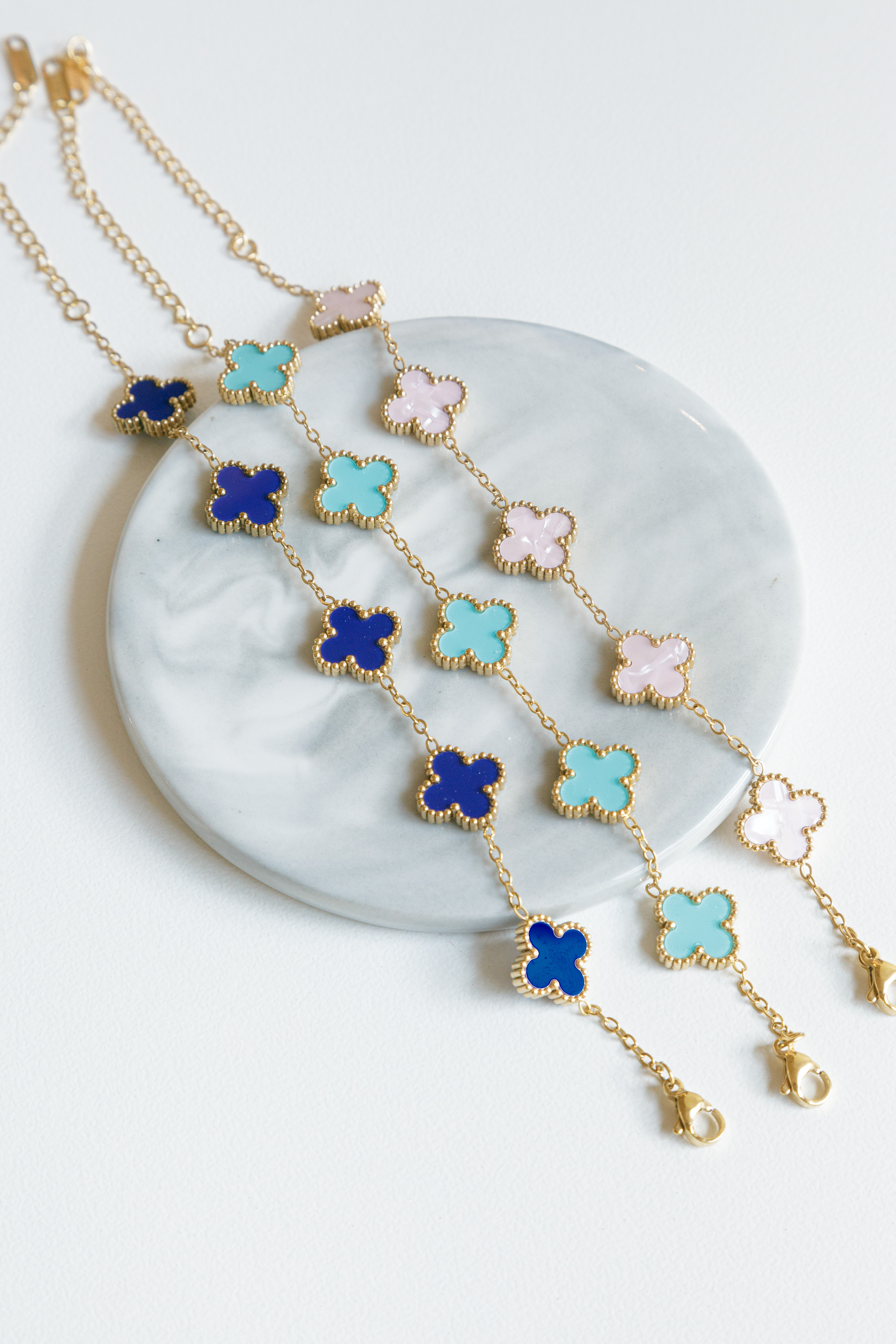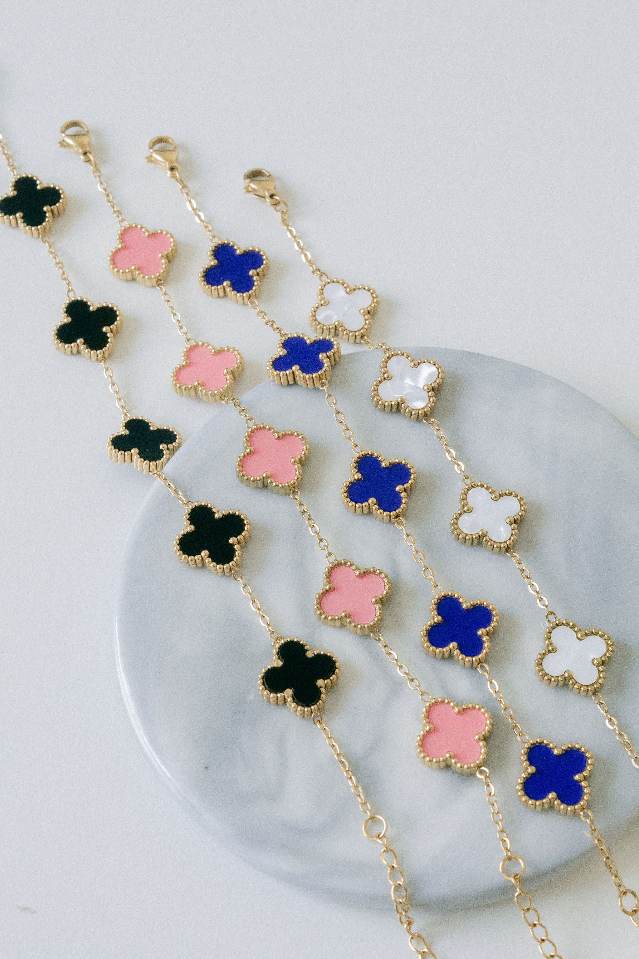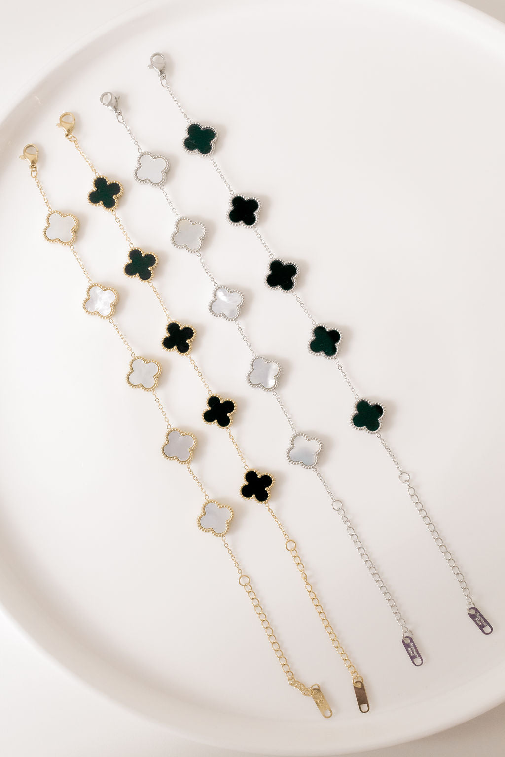 An adjustable stainless steel bracelet with five clovers. Available in a variety of colours.