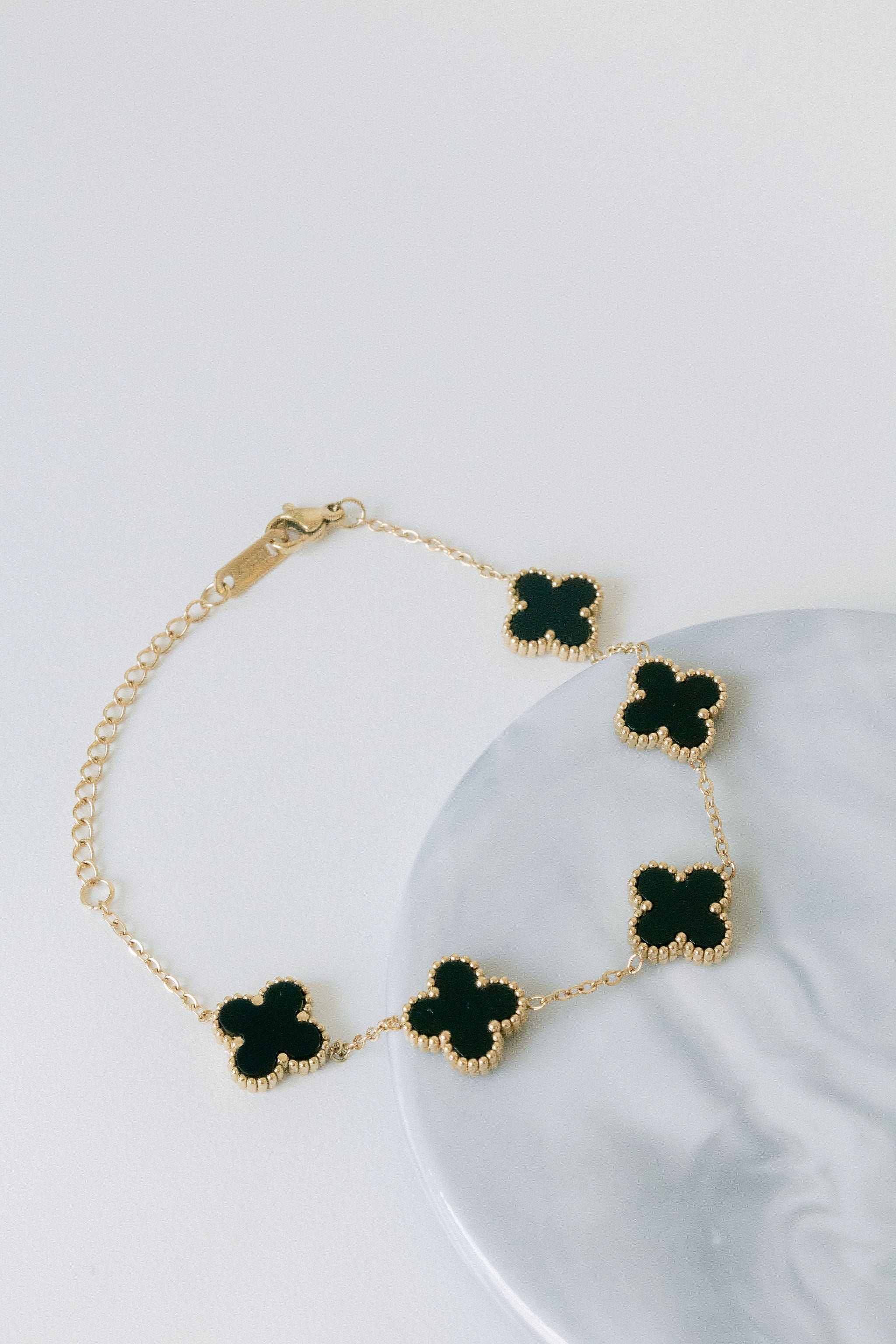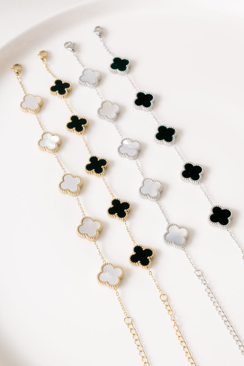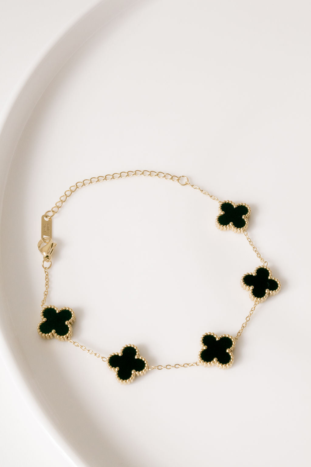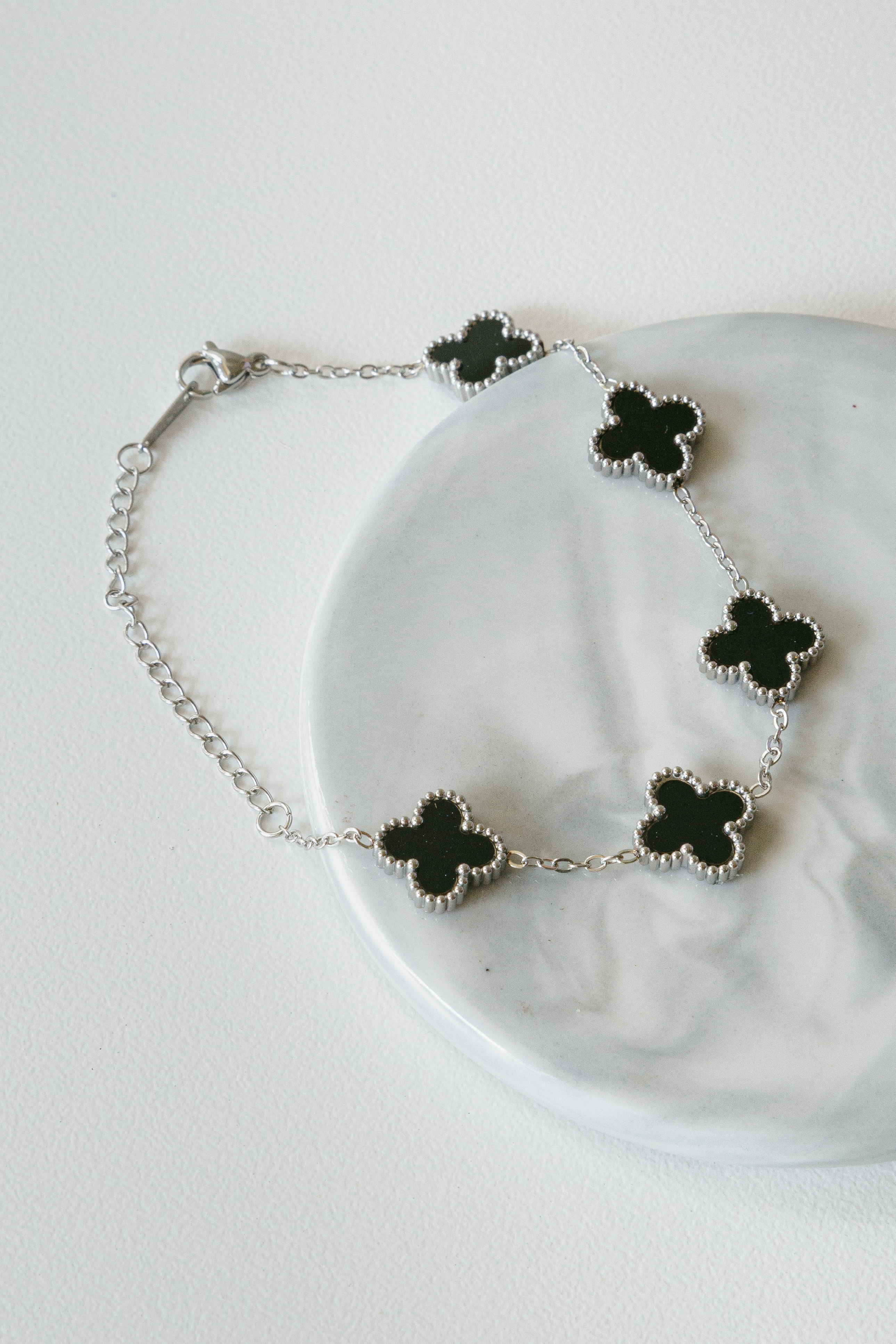 An adjustable stainless steel bracelet with five clovers. Available in a variety of colours.