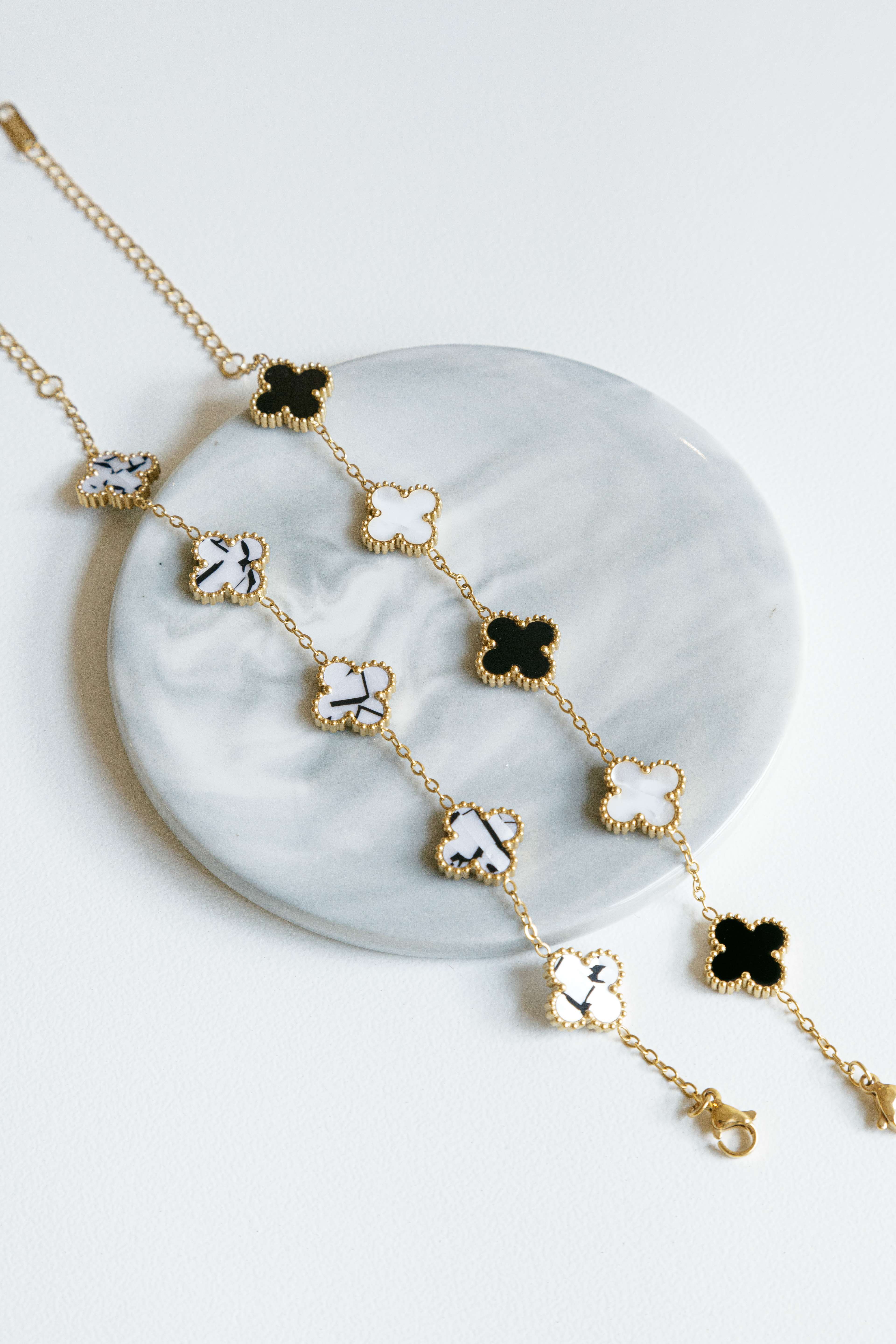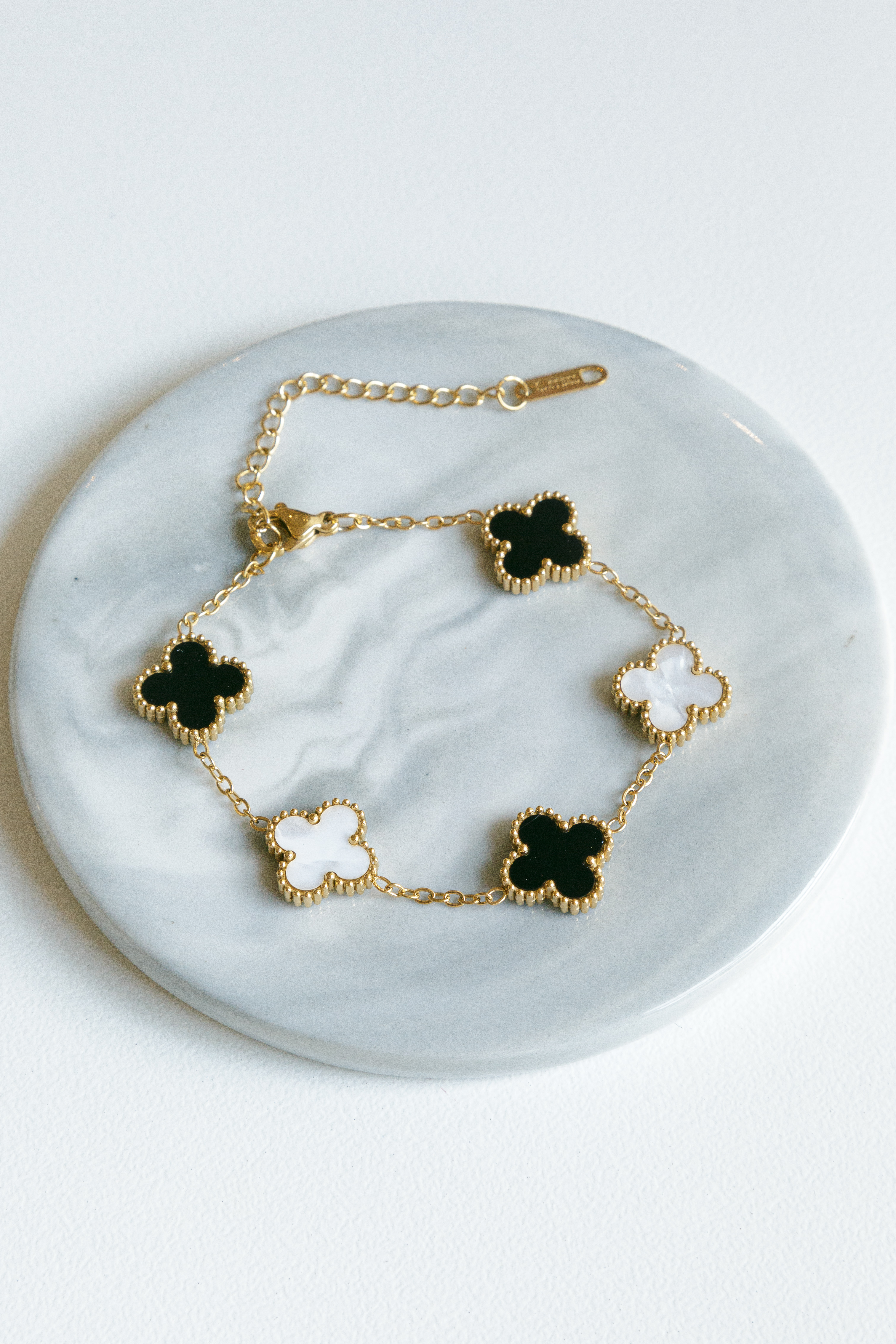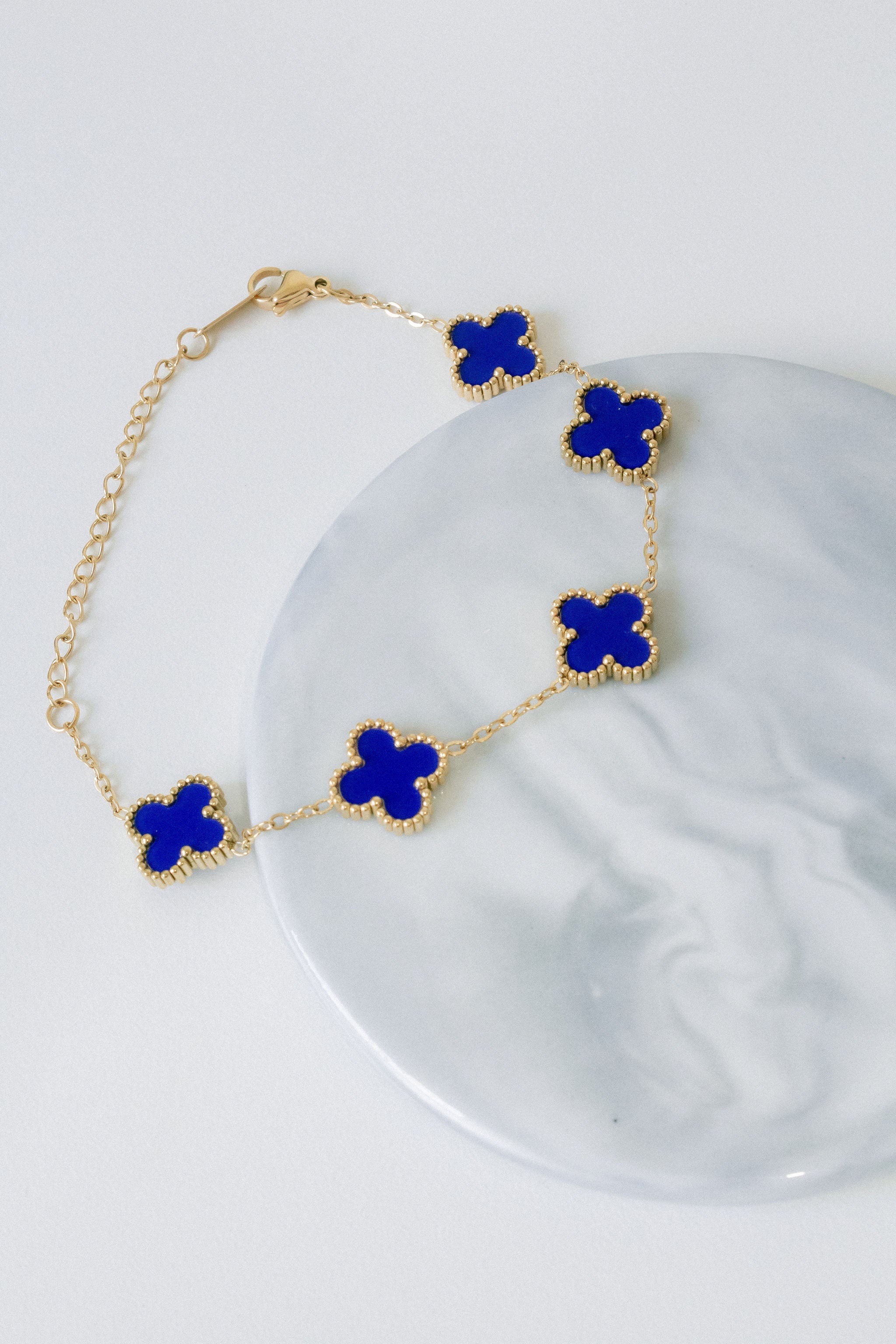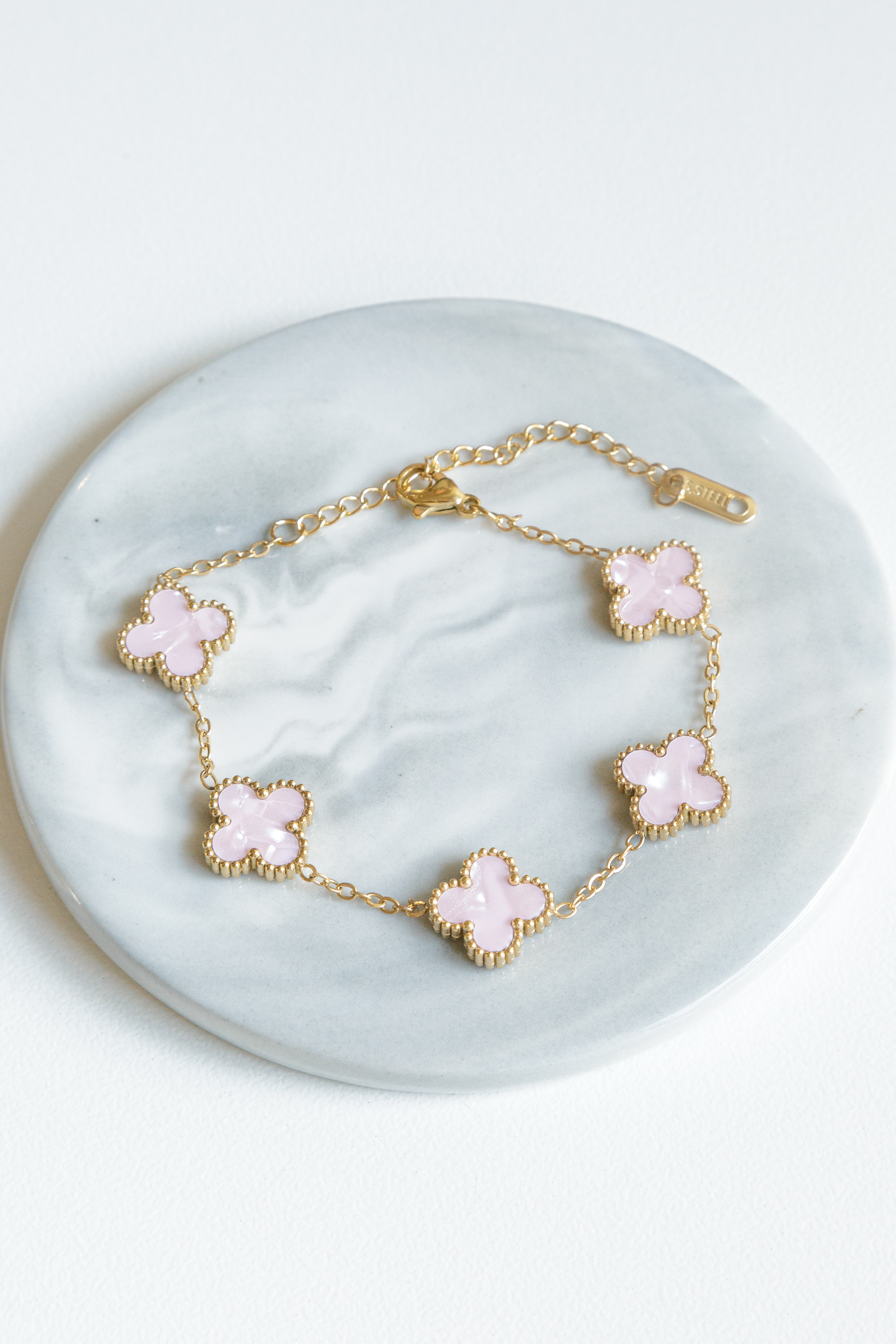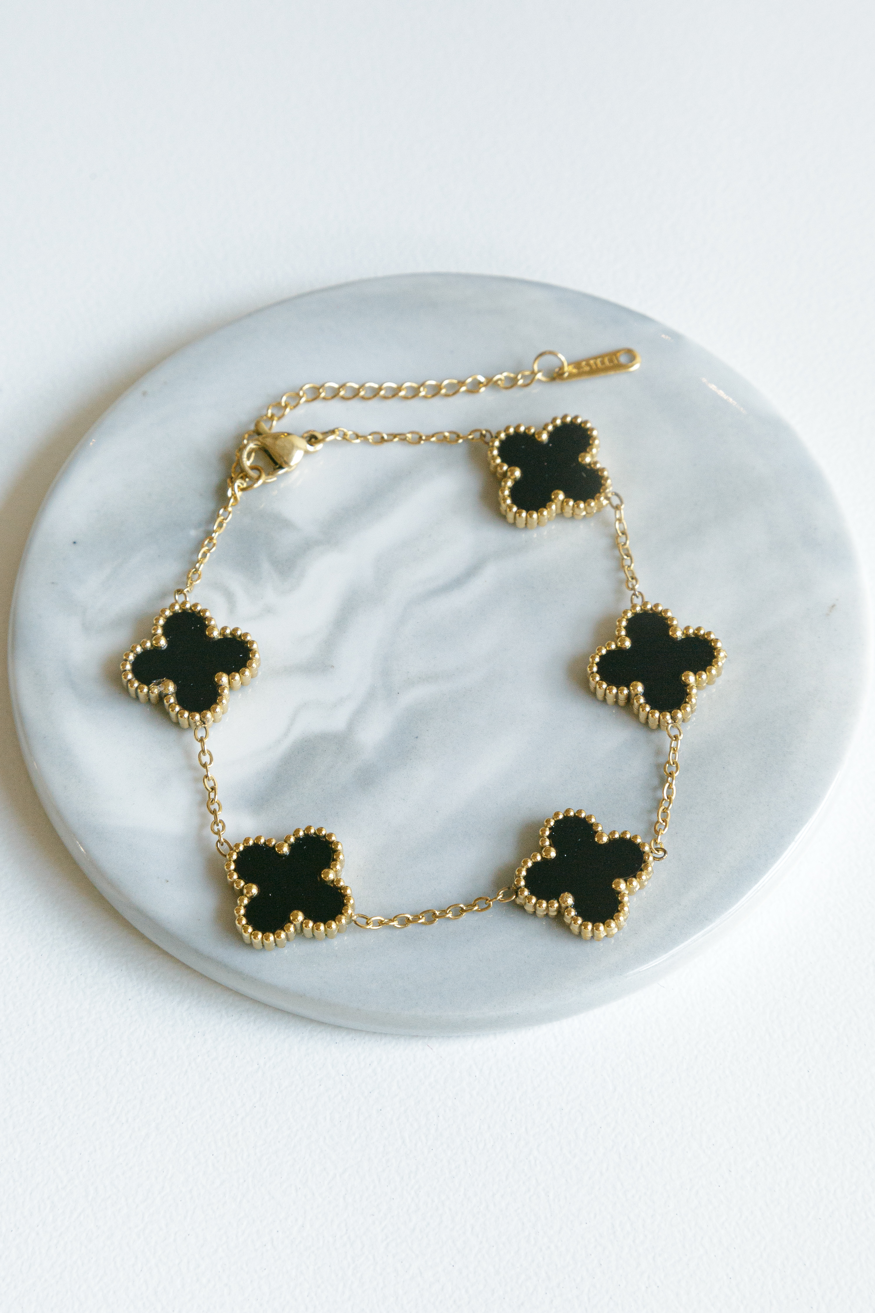 An adjustable stainless steel bracelet with five clovers. Available in a variety of colours.