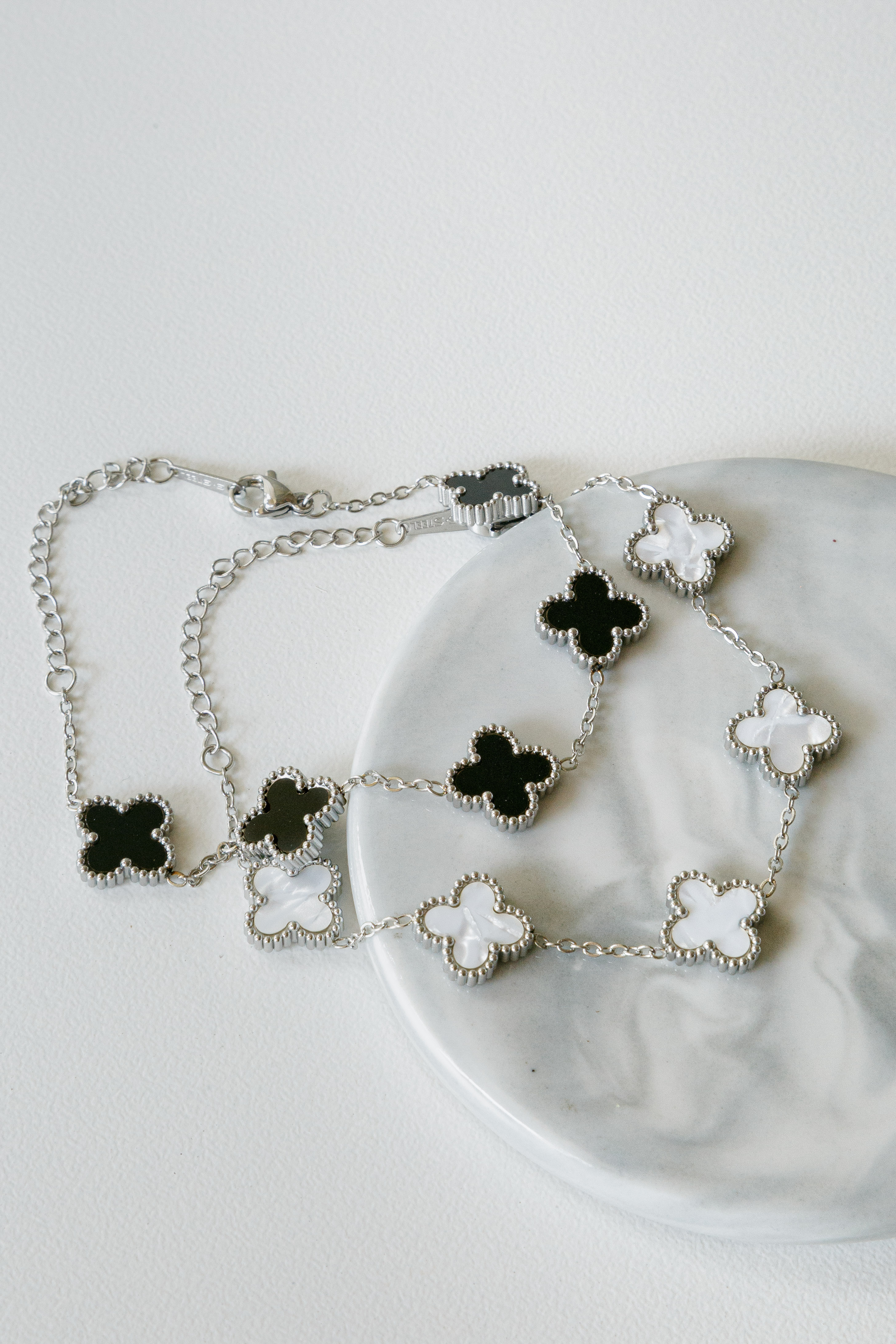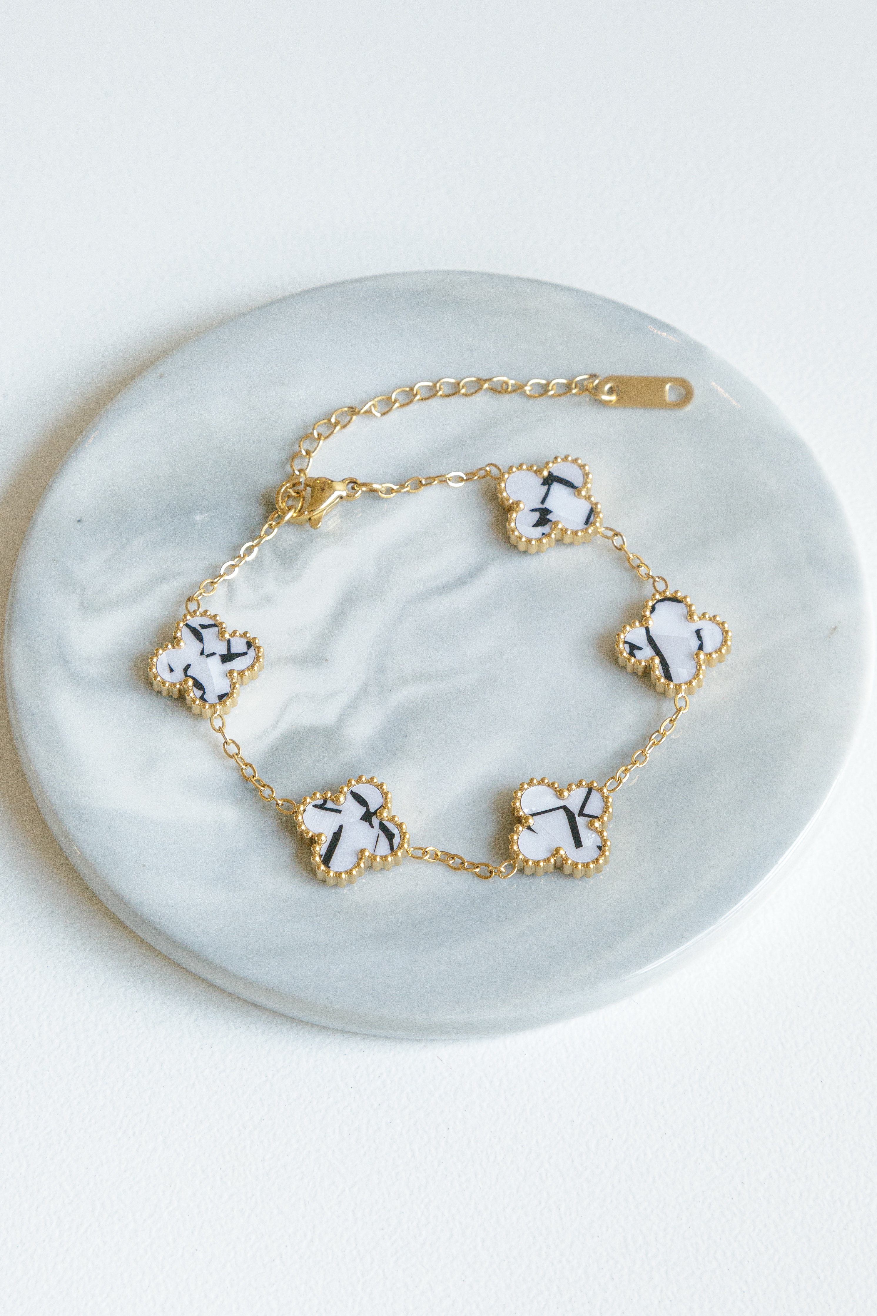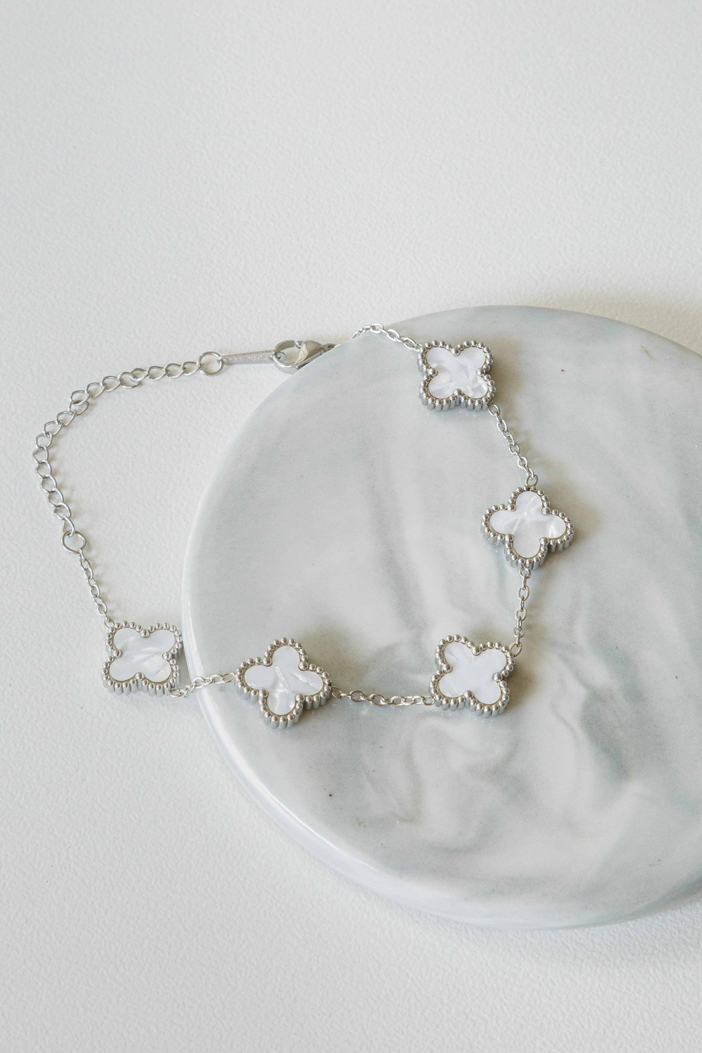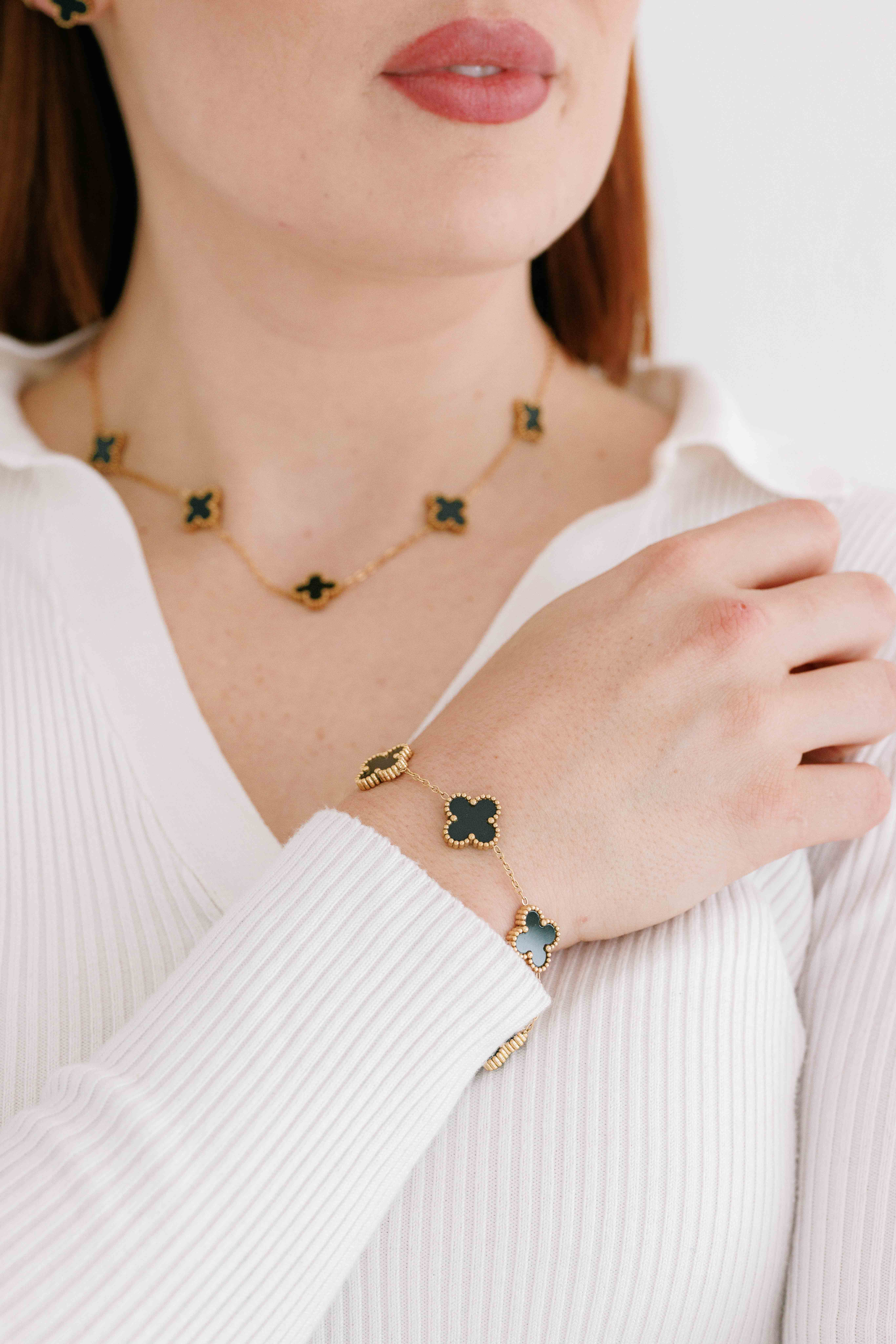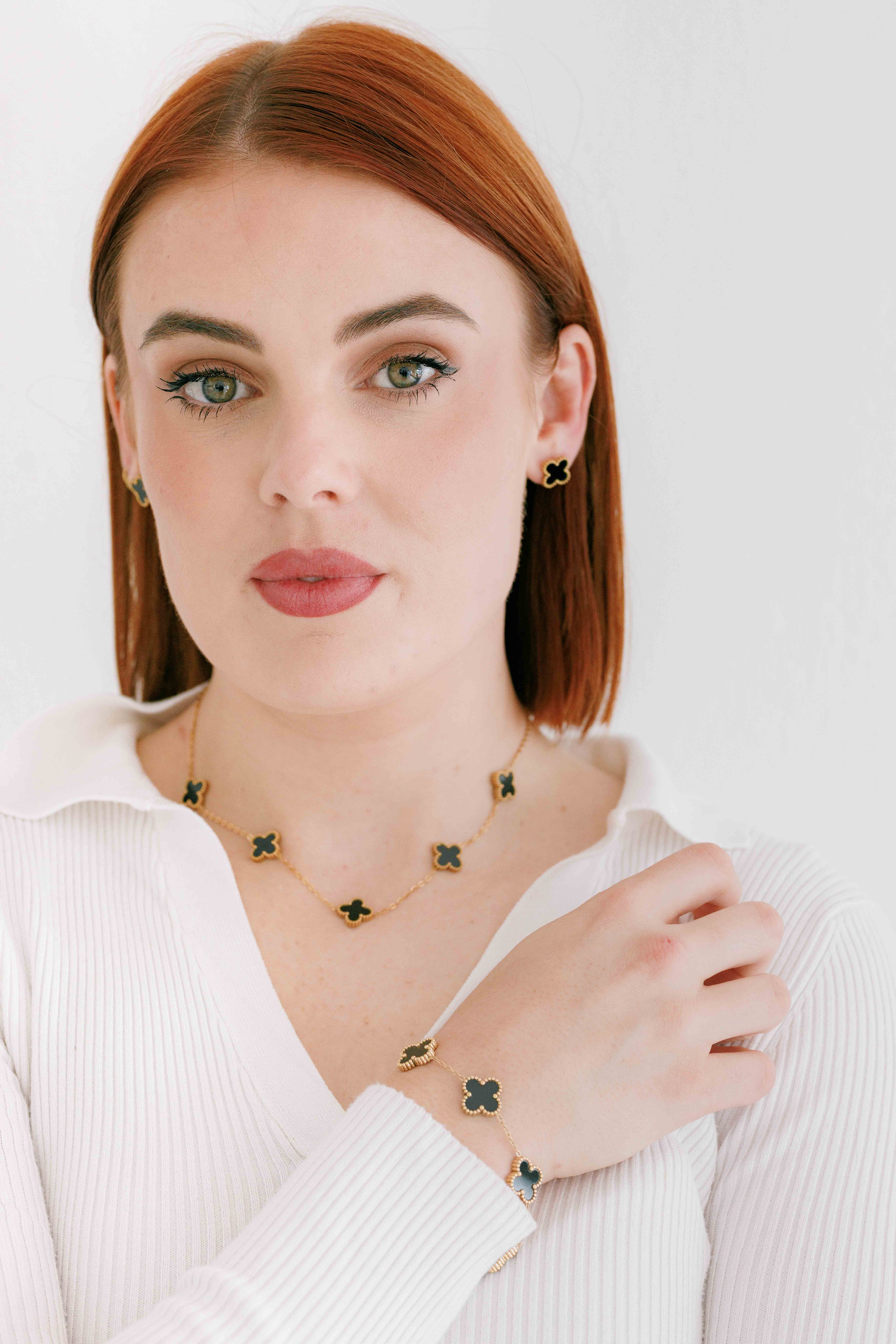 An adjustable stainless steel bracelet with five clovers. Available in a variety of colours.