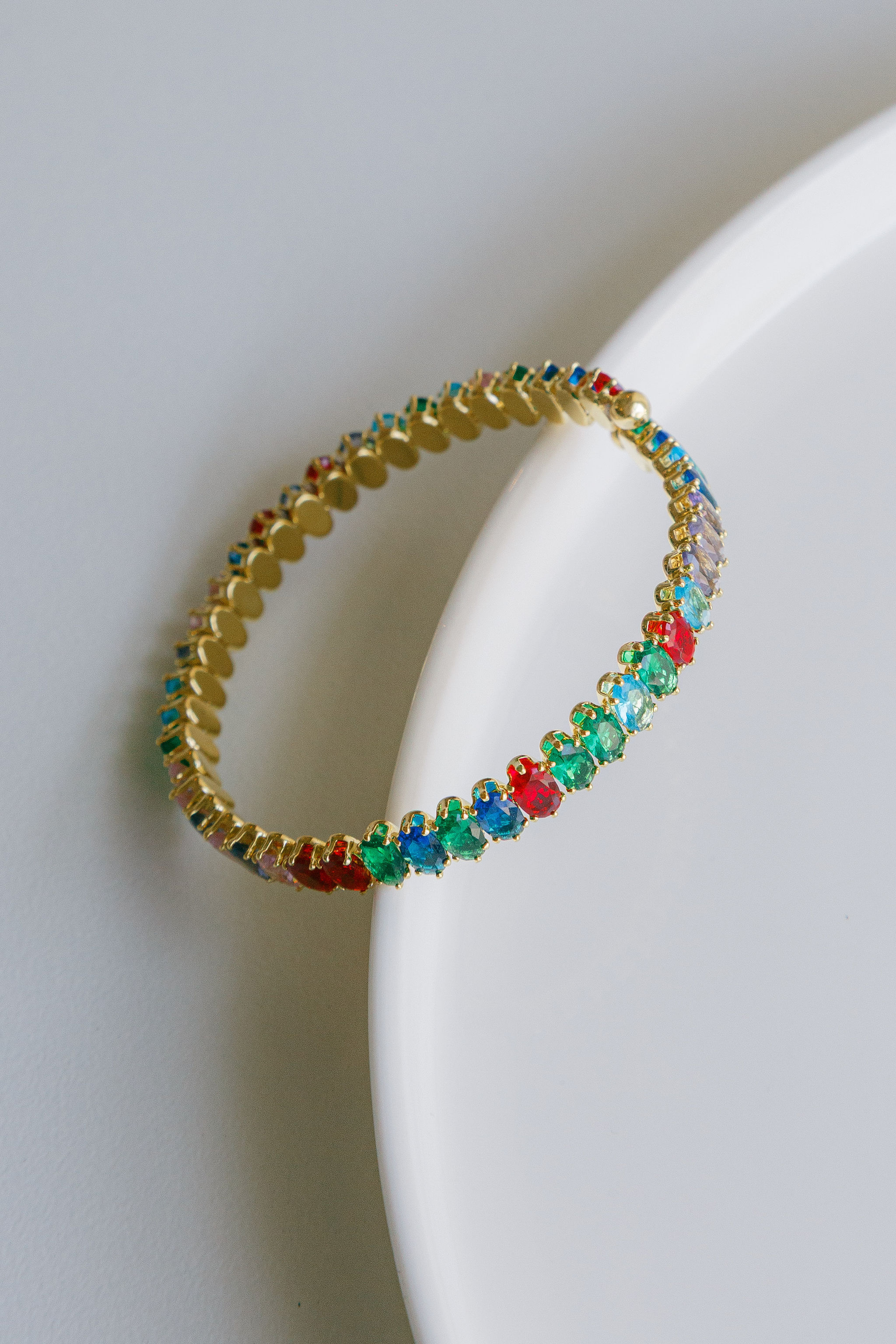 An oval multi-coloured diamond rhinestone bracelet. Available in gold and silver.