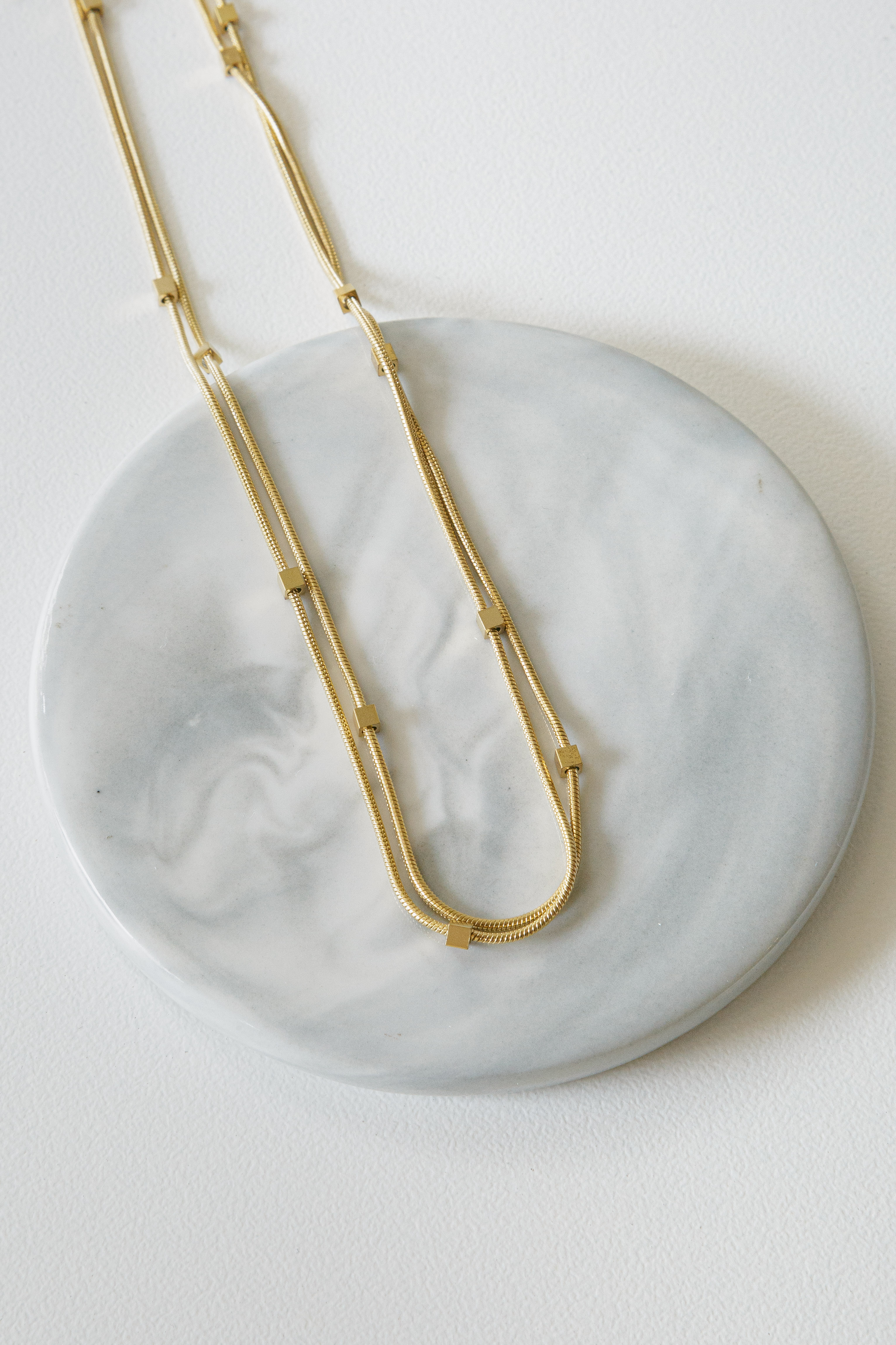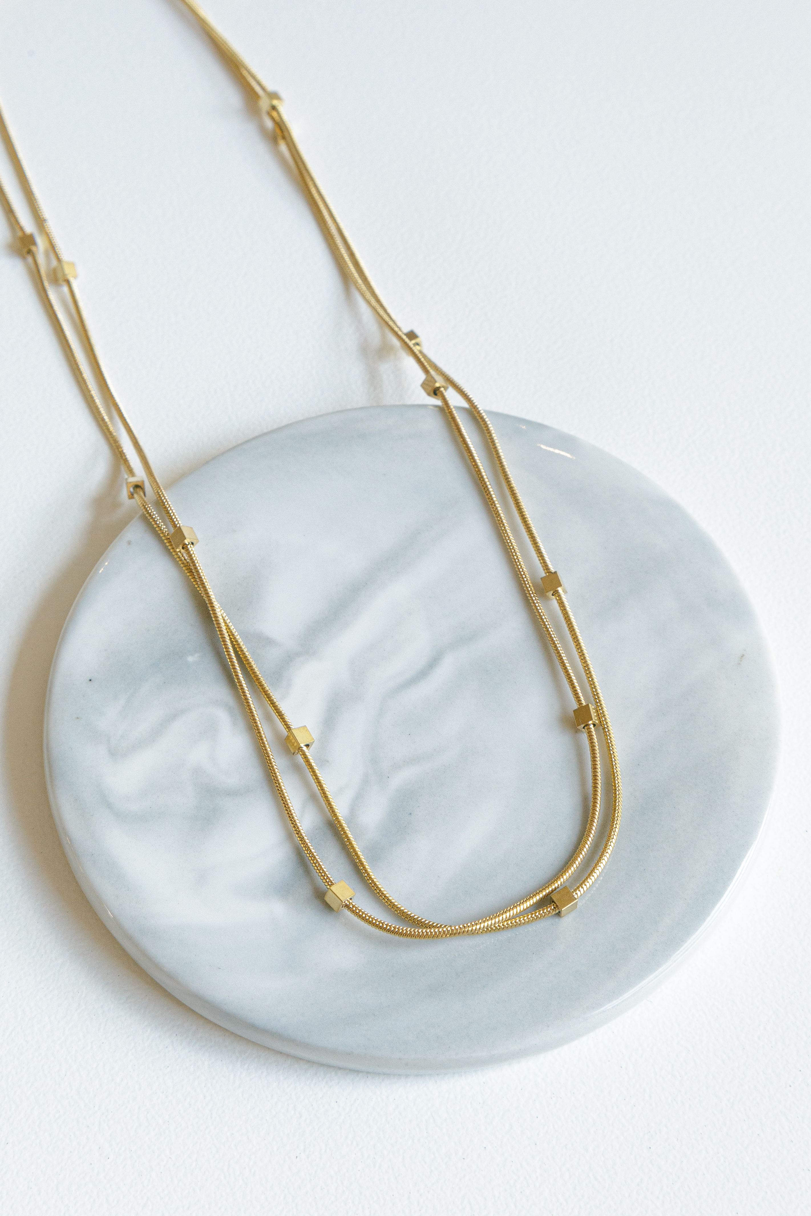 A double rope chain necklace with square beads. Available in silver and gold.