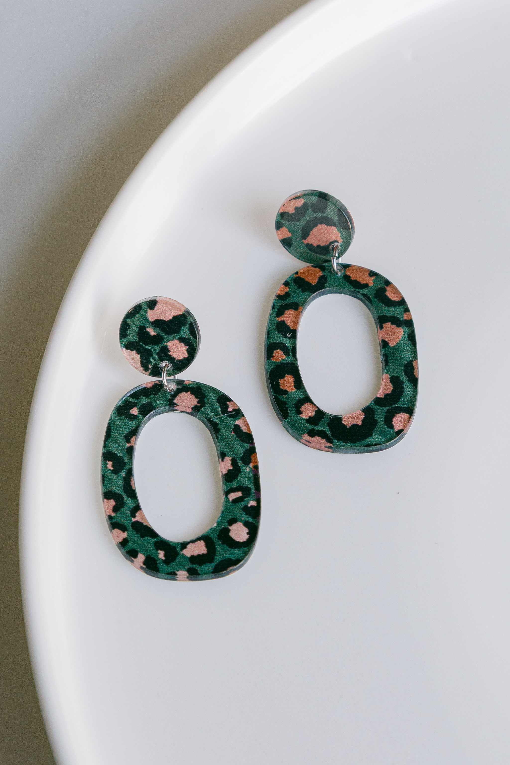 Locally, handmade perspex earrings with a variety of shapes and prints.