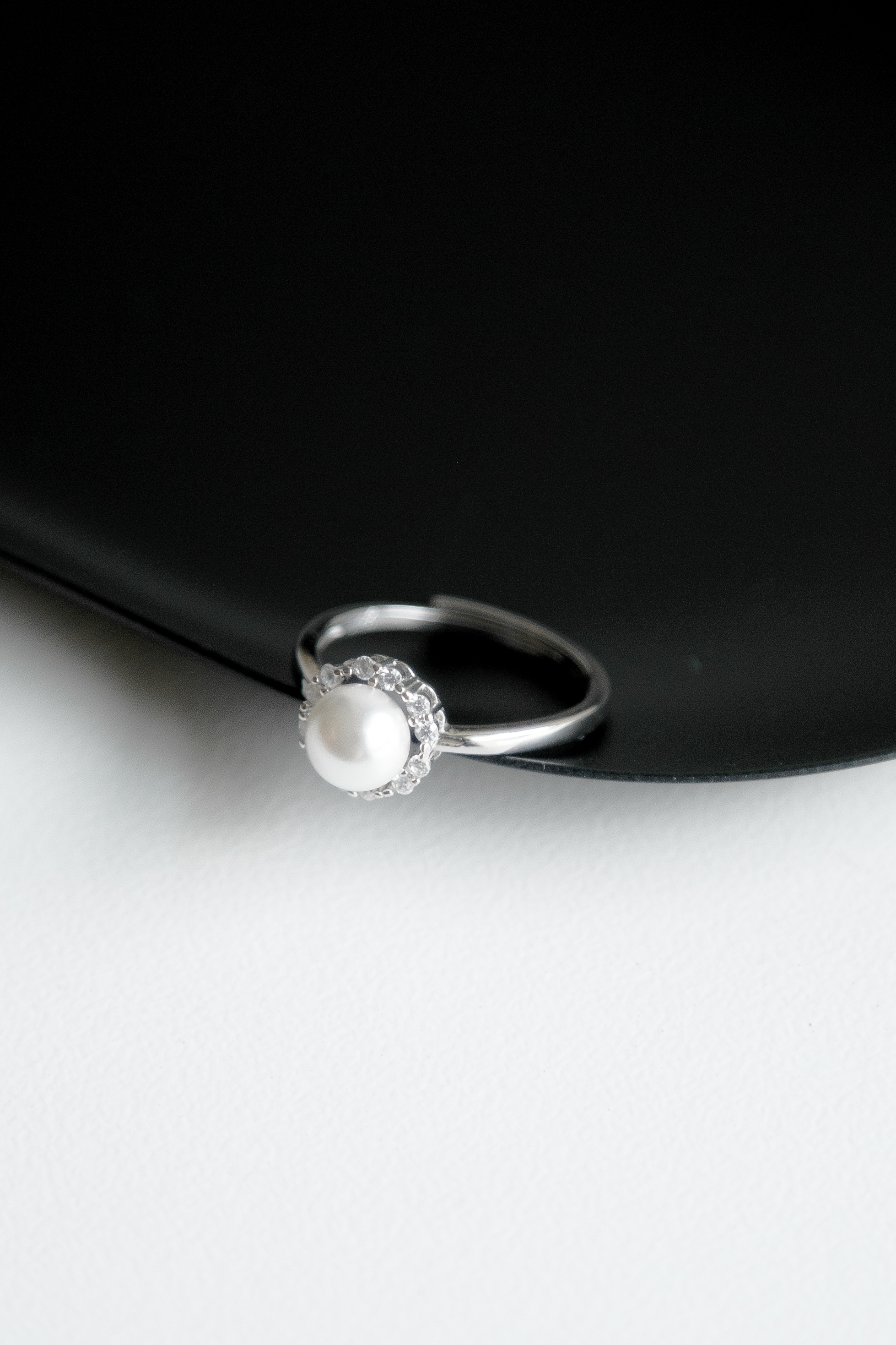 A sterling silver ring with shell pearl and cubic zirconia diamante.