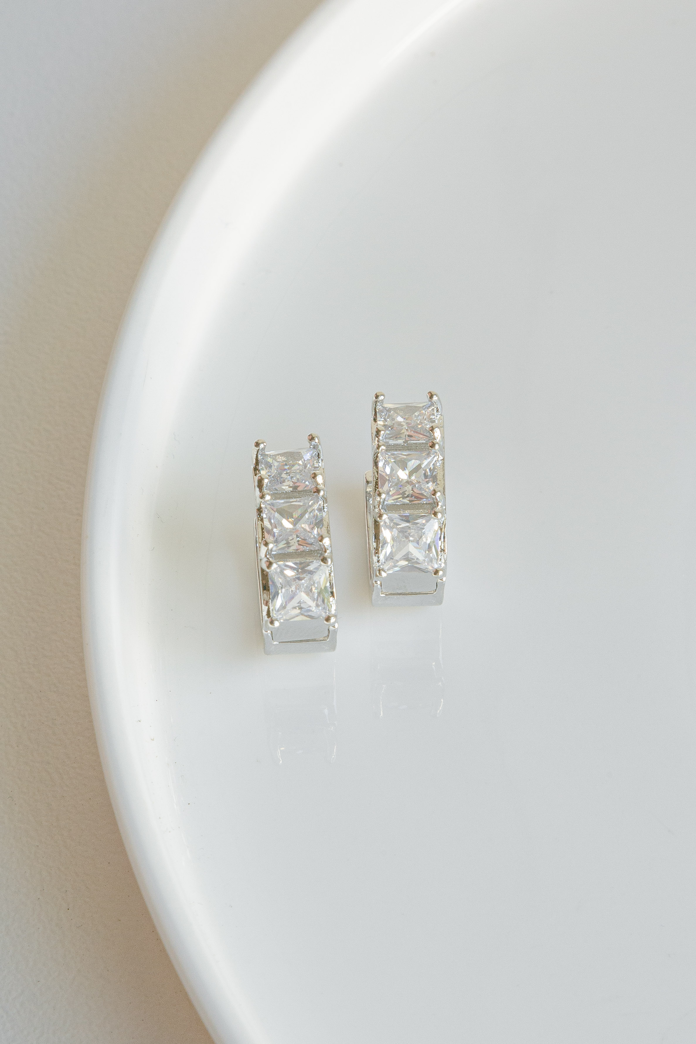 A U-shaped huggie earring with three diamond rhinestones. Available in Gold and Silver.