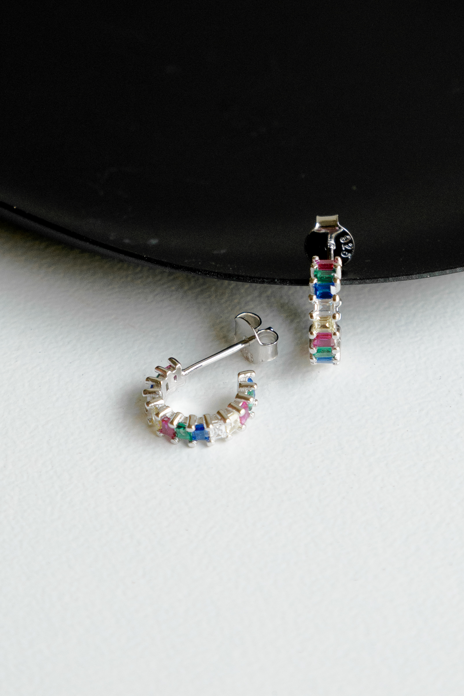 Sterling silver 3/4 hoop earrings with multi-colour cubic zirconia baugettes. Small and medium sizes.