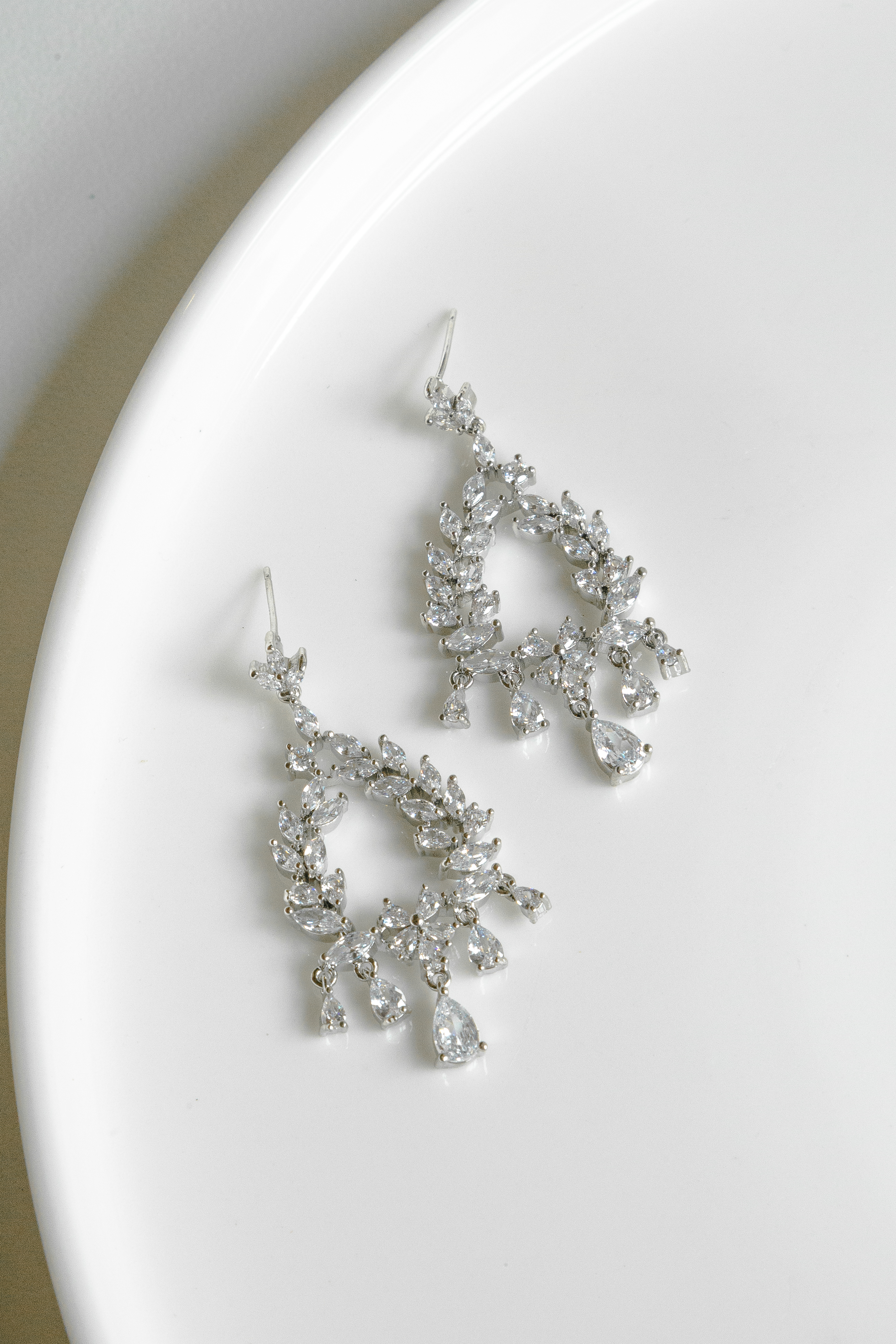 An elegant silver chandelier earring with diamond rhinestones.