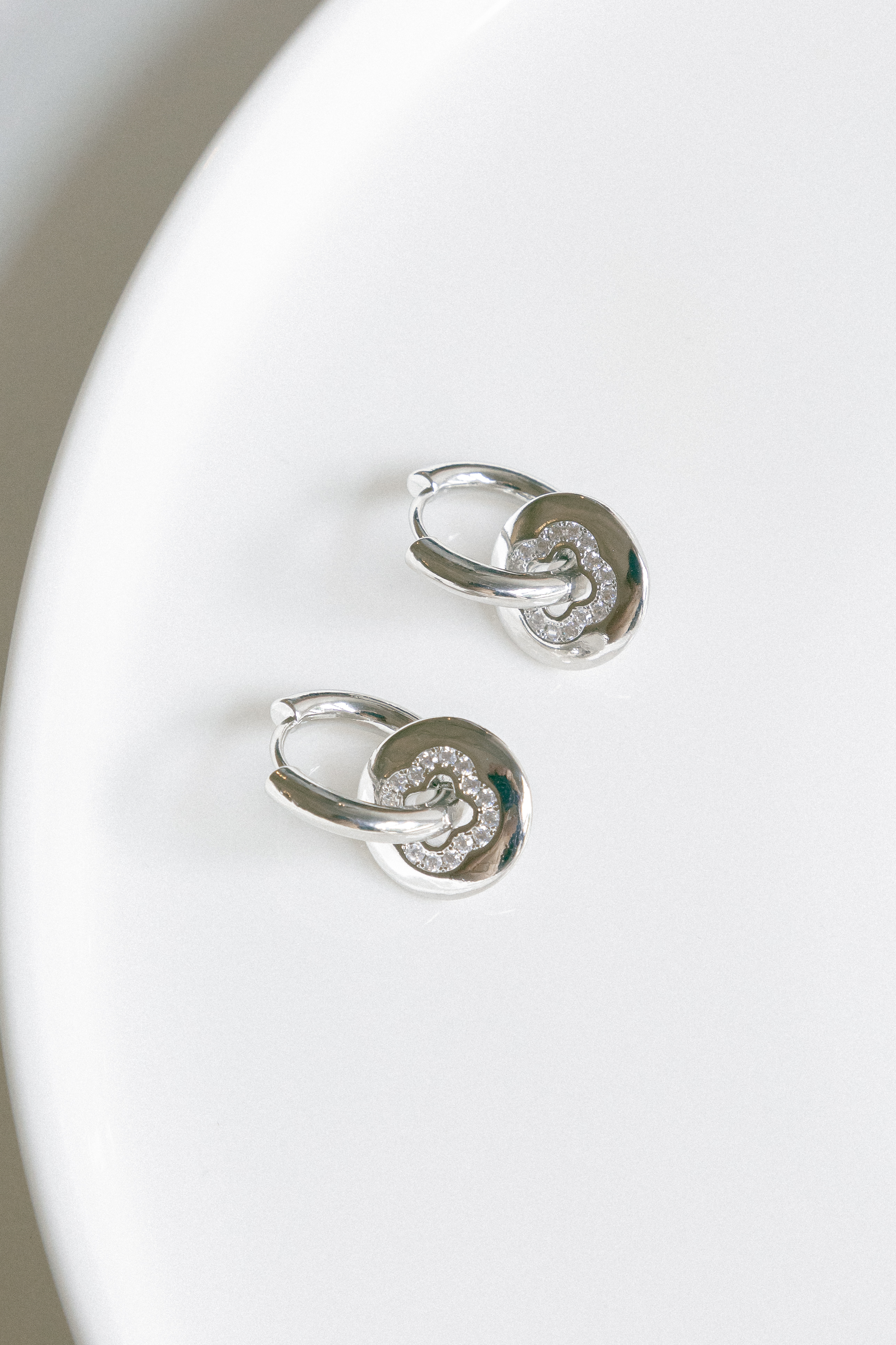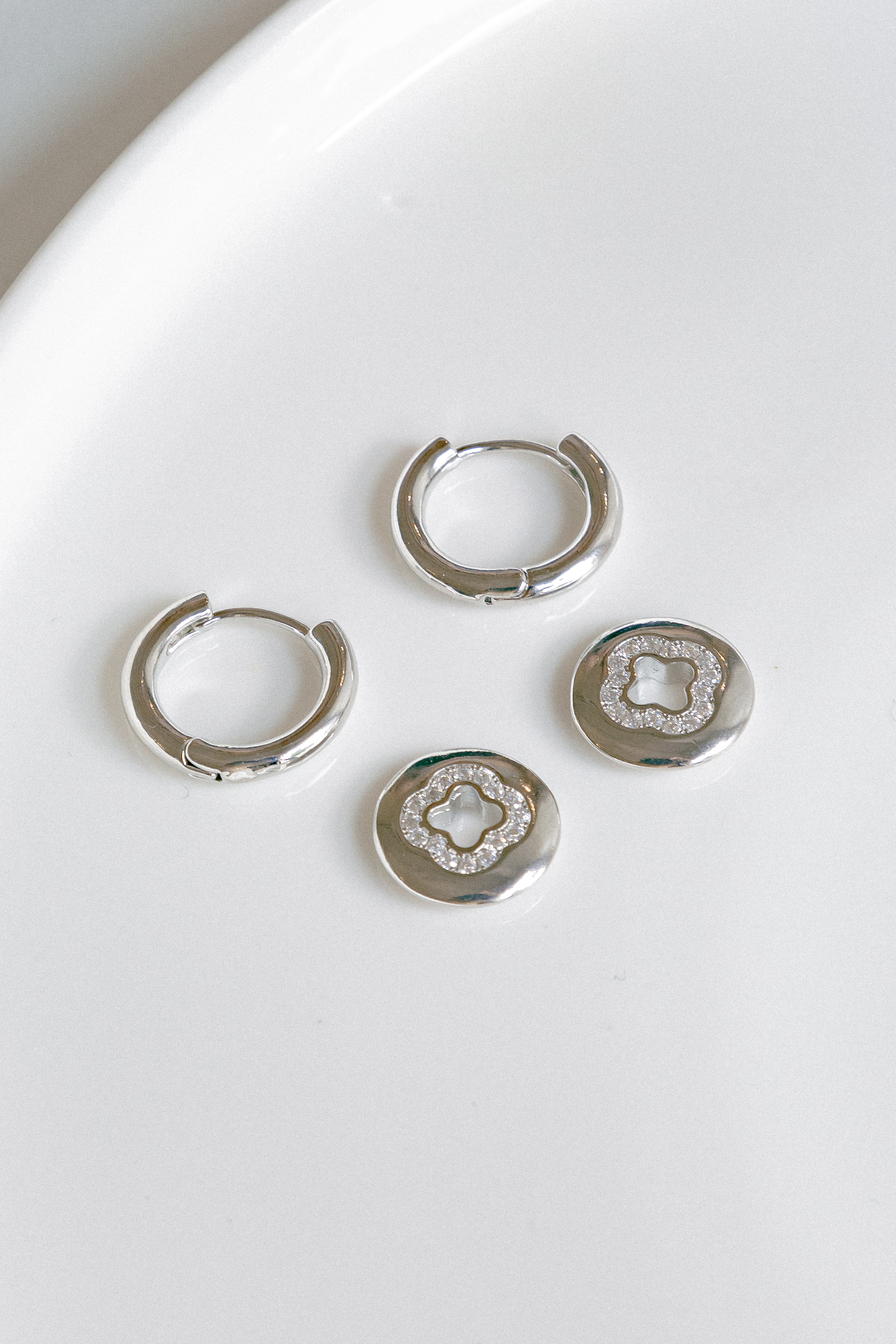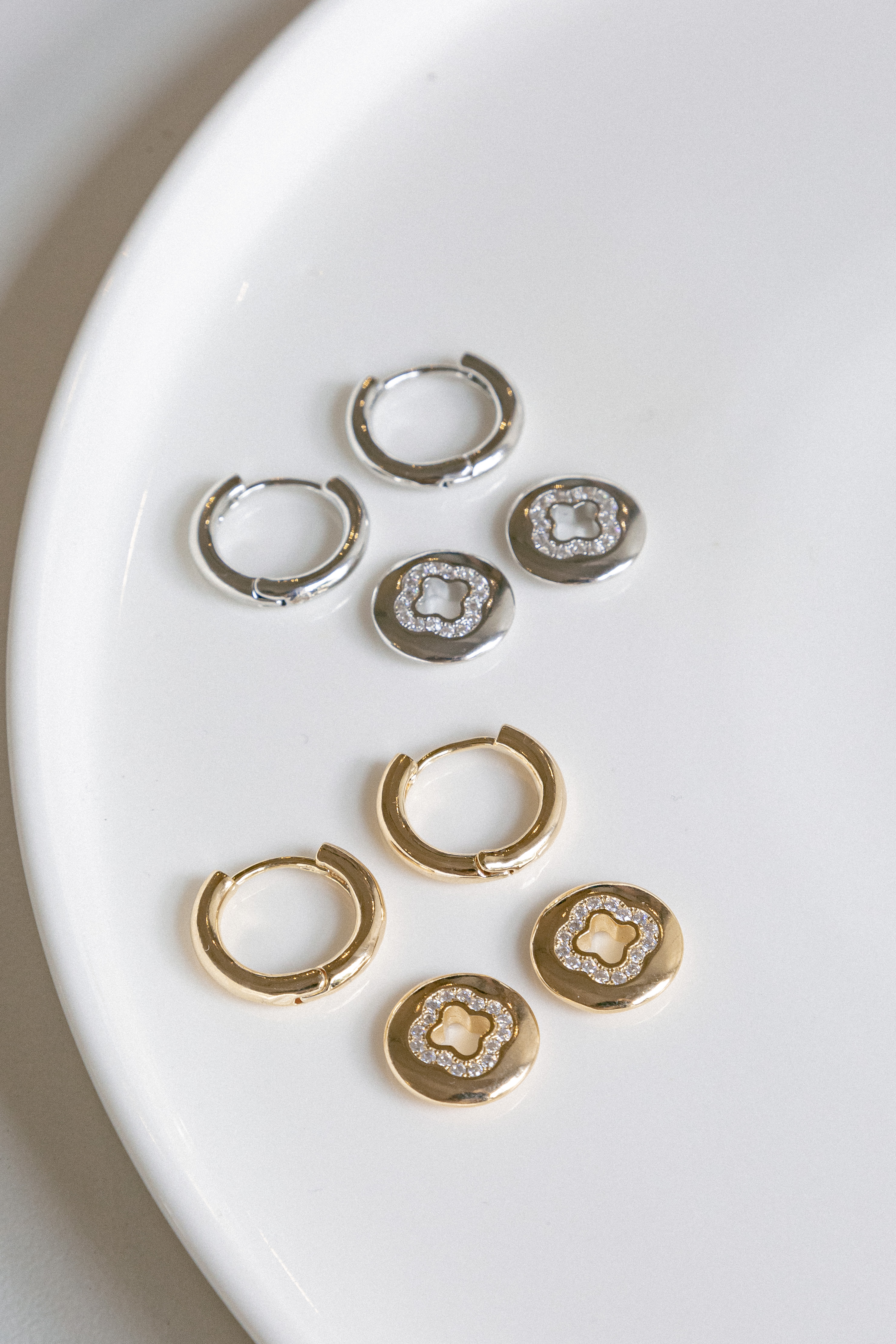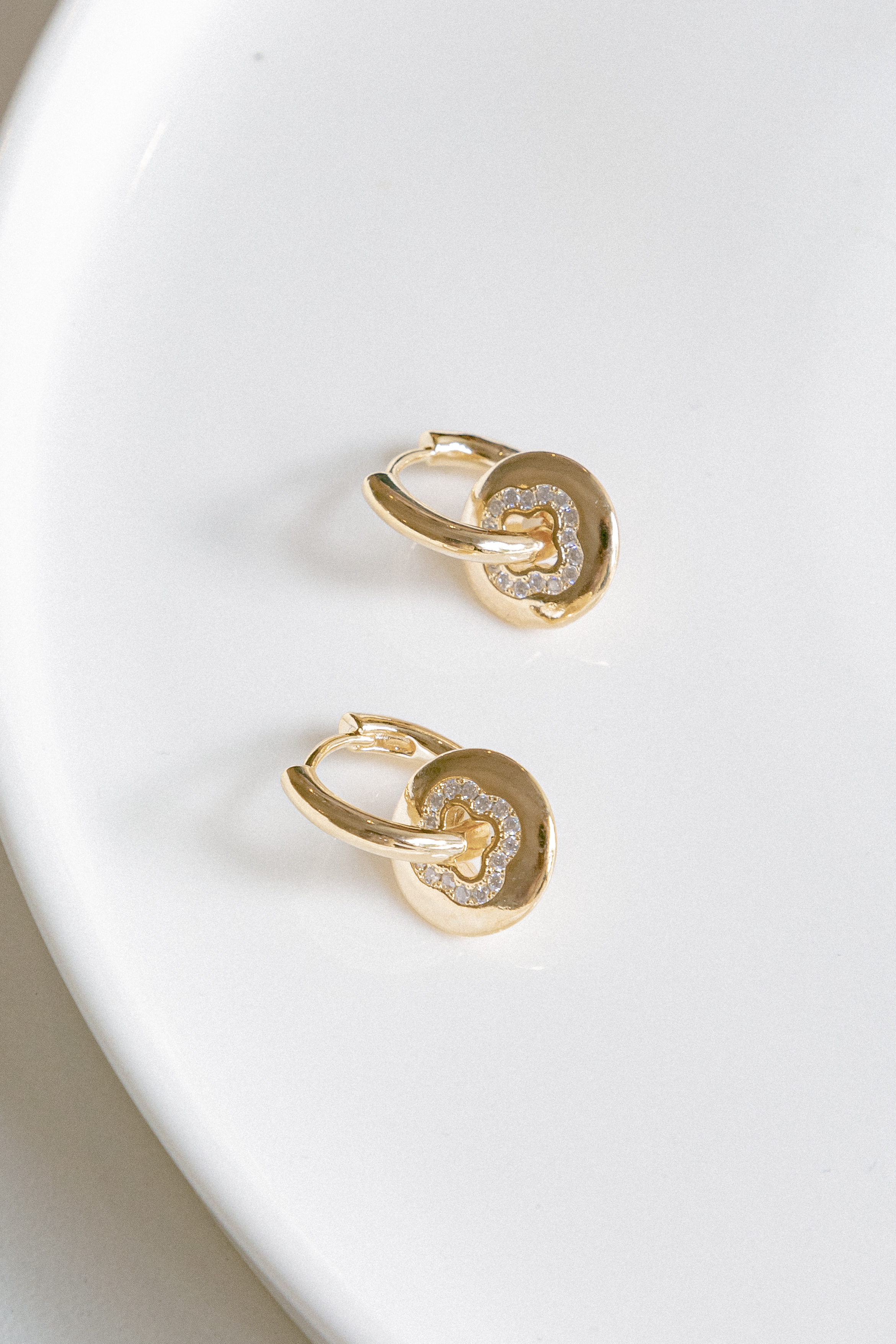A two-in-one gold or silver huggie earring with detachable round disc with diamante clover detail.