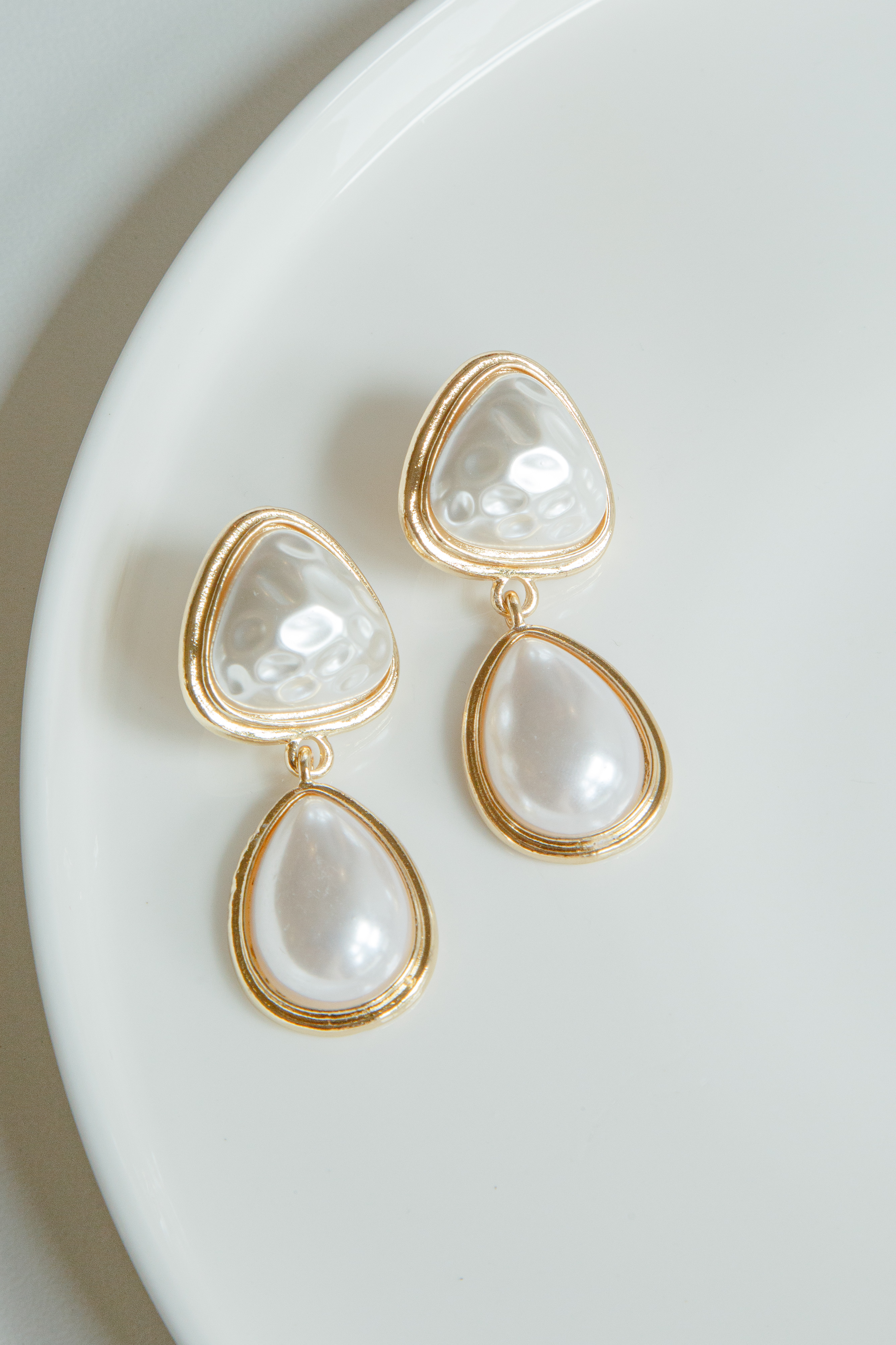 A modern double faux pearl earring with gold trimming.