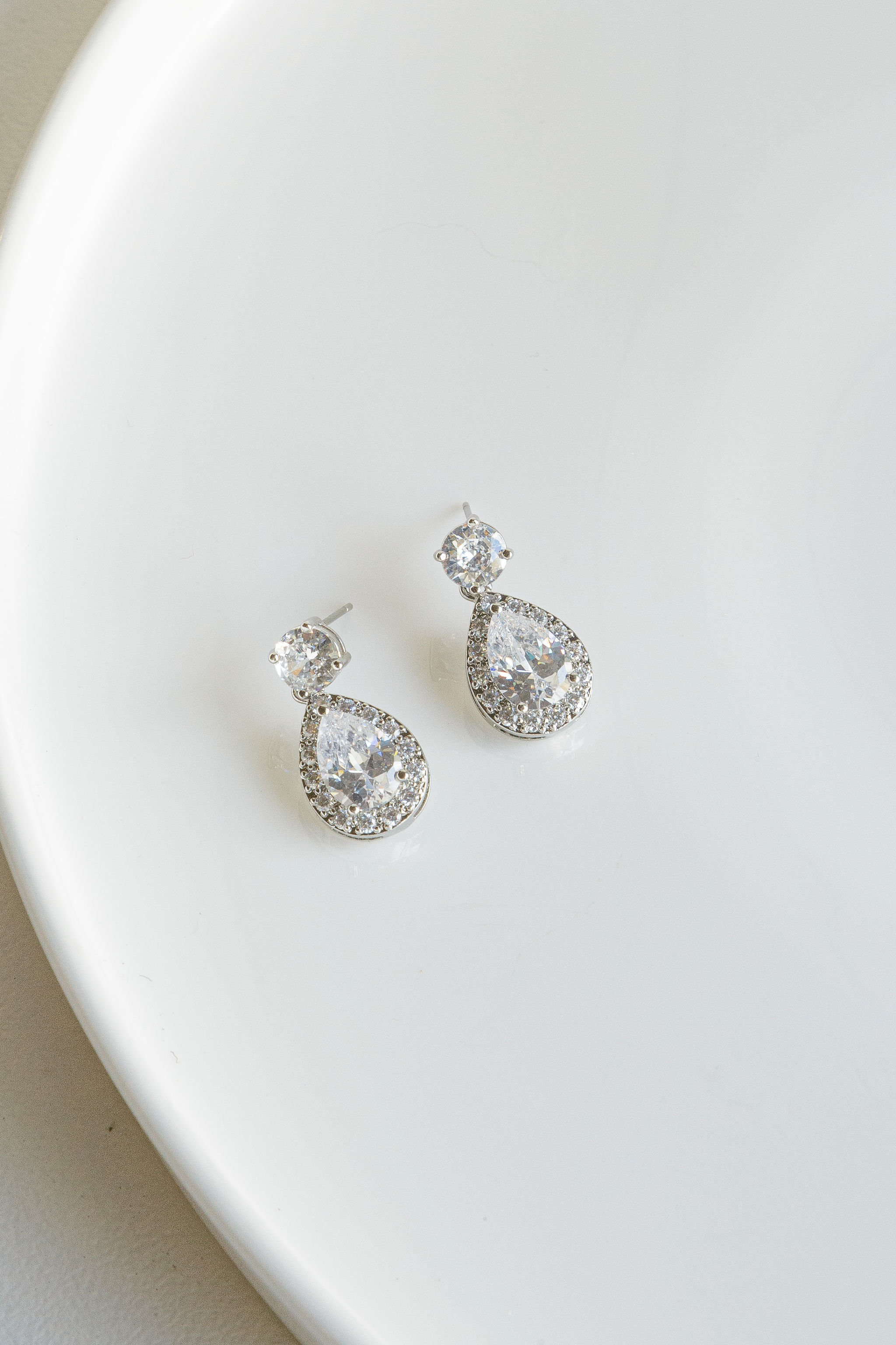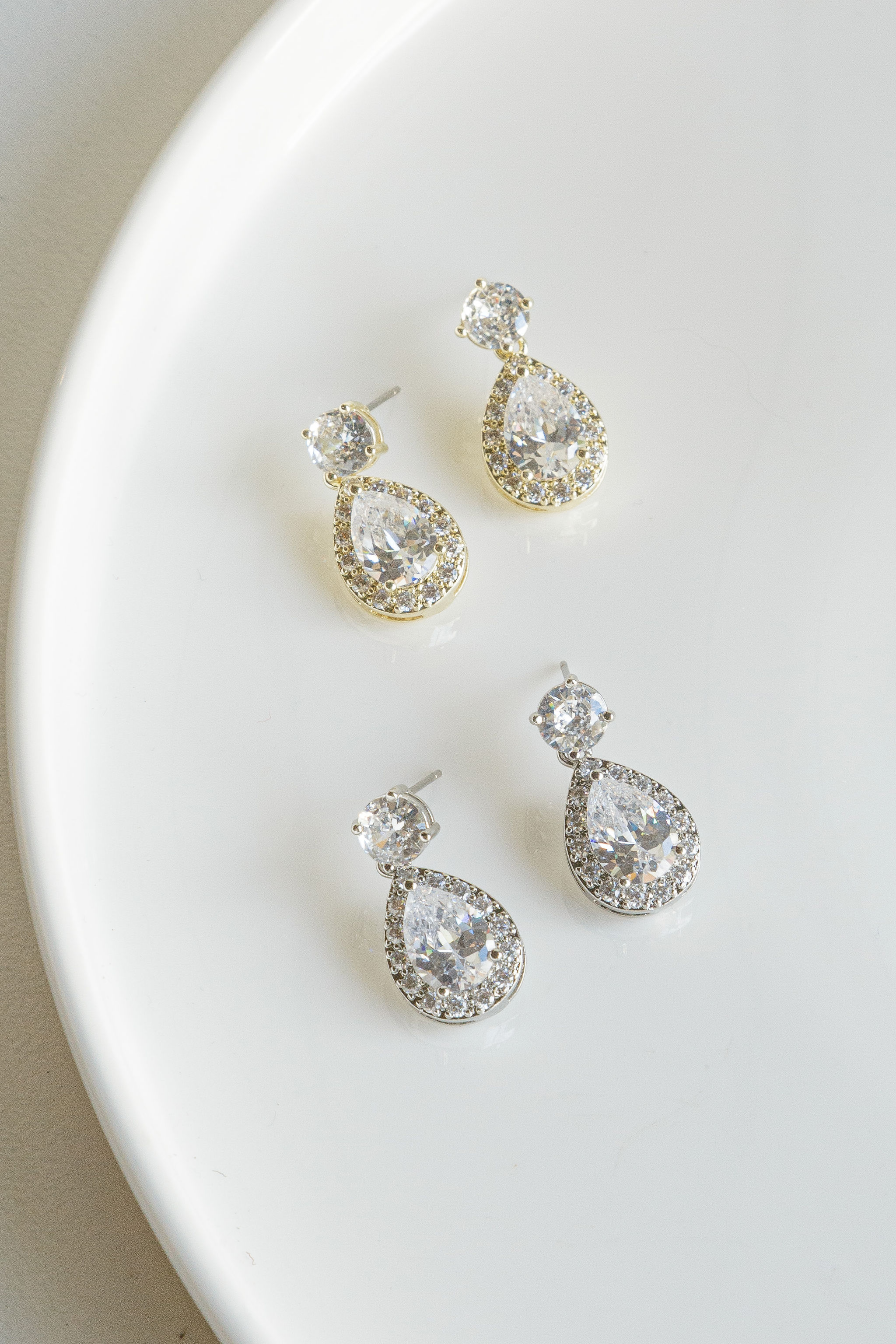 Gold/silver diamond rhinestone stud earring with pear diamond drop and diamante trimming.