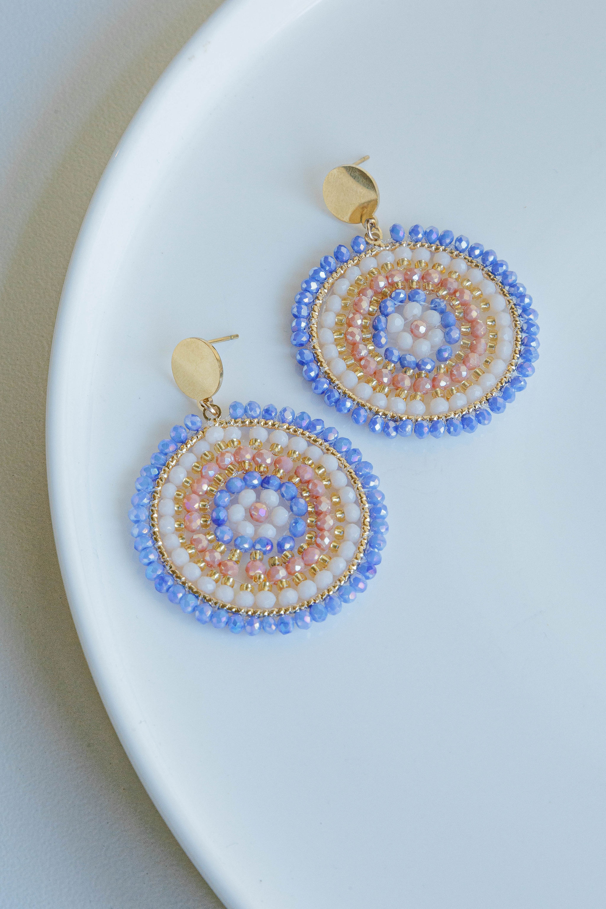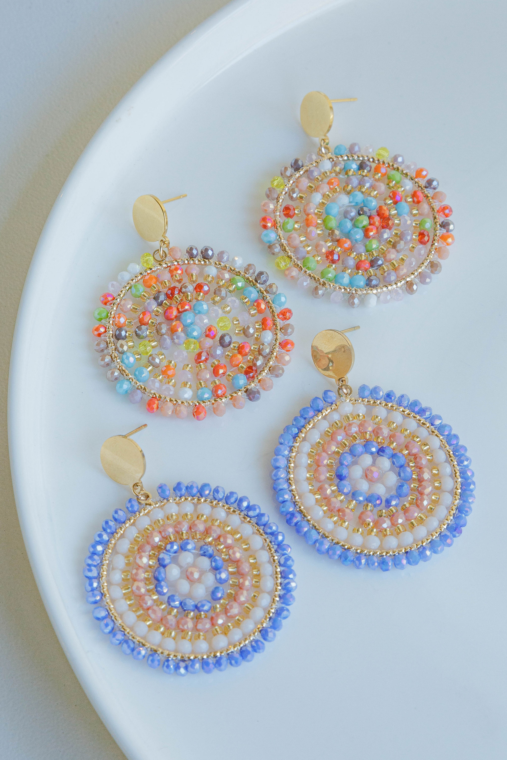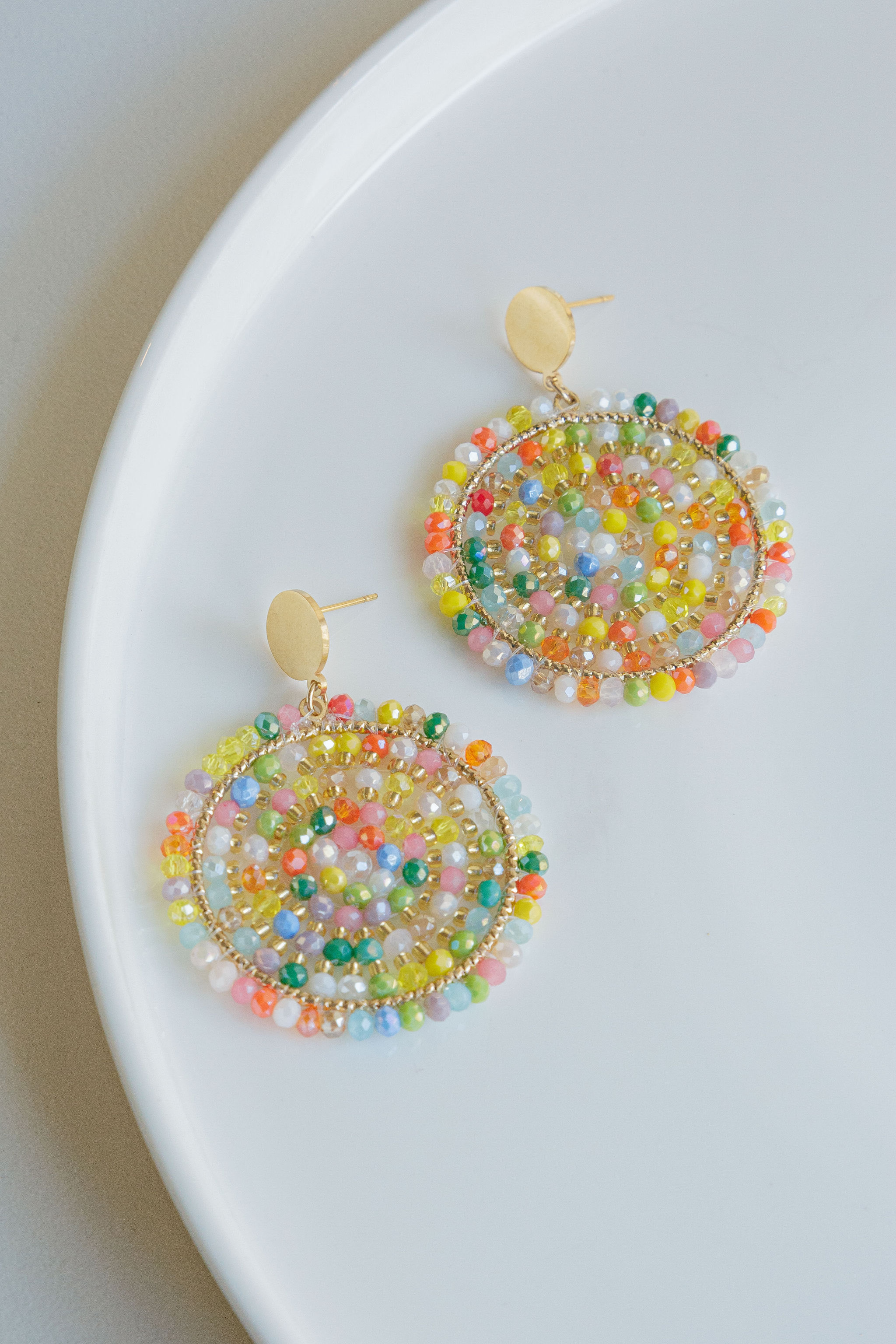 A gold stud earring with crystal beaded disc. Availabe in purple, bright multi-coloured, warm multicoloured and black and grey.