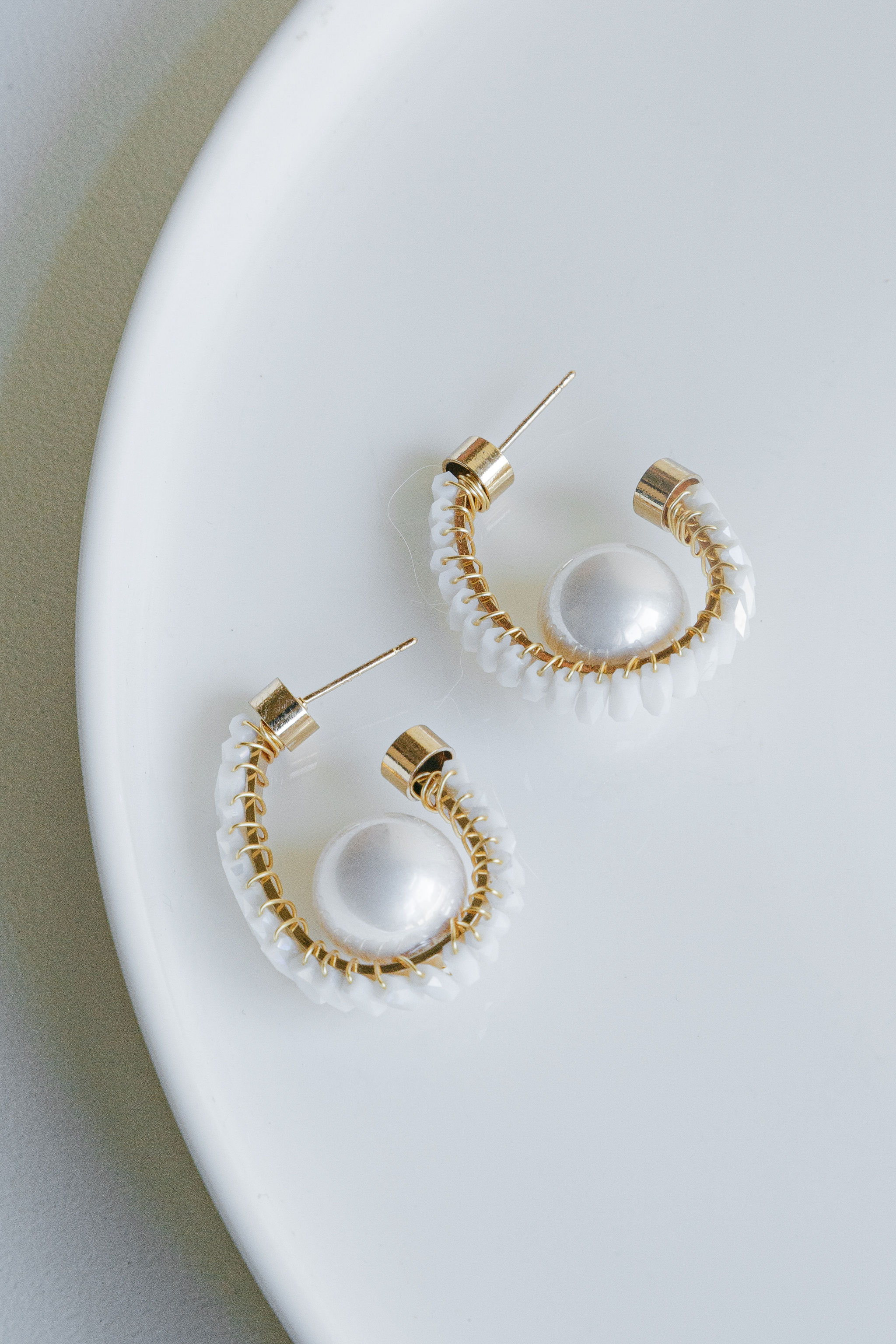 A crystal beaded hoop earring with large pearl detail and gold trimmings. Available in white, black, red, light pink and light green.