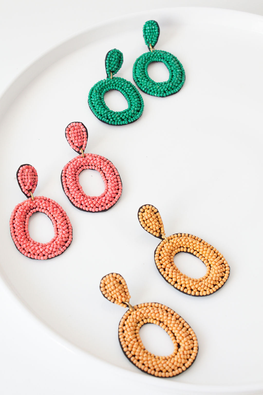 A beaded oval drop earring. Available in green, mustard yellow and pink.