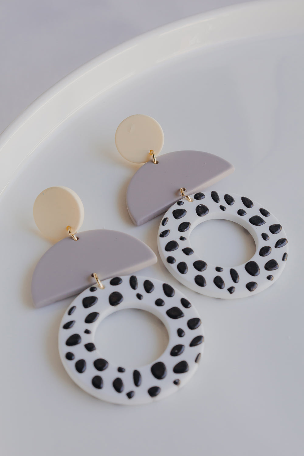 A large black and white synthetic clay circle drop earring with a grey half moon and a cream stud.