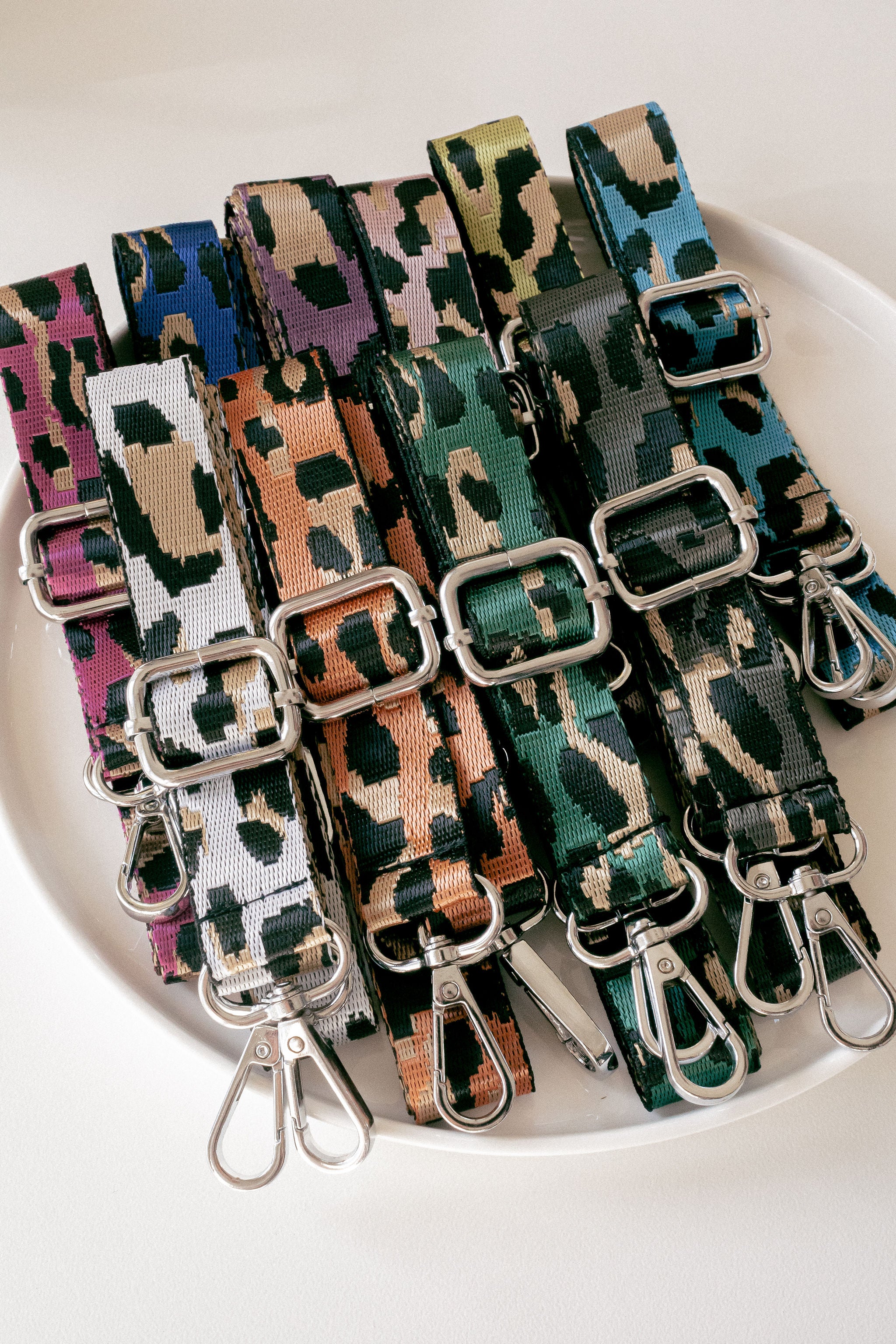 An adjustable animal print handbag strap. Available in a variety of colours.