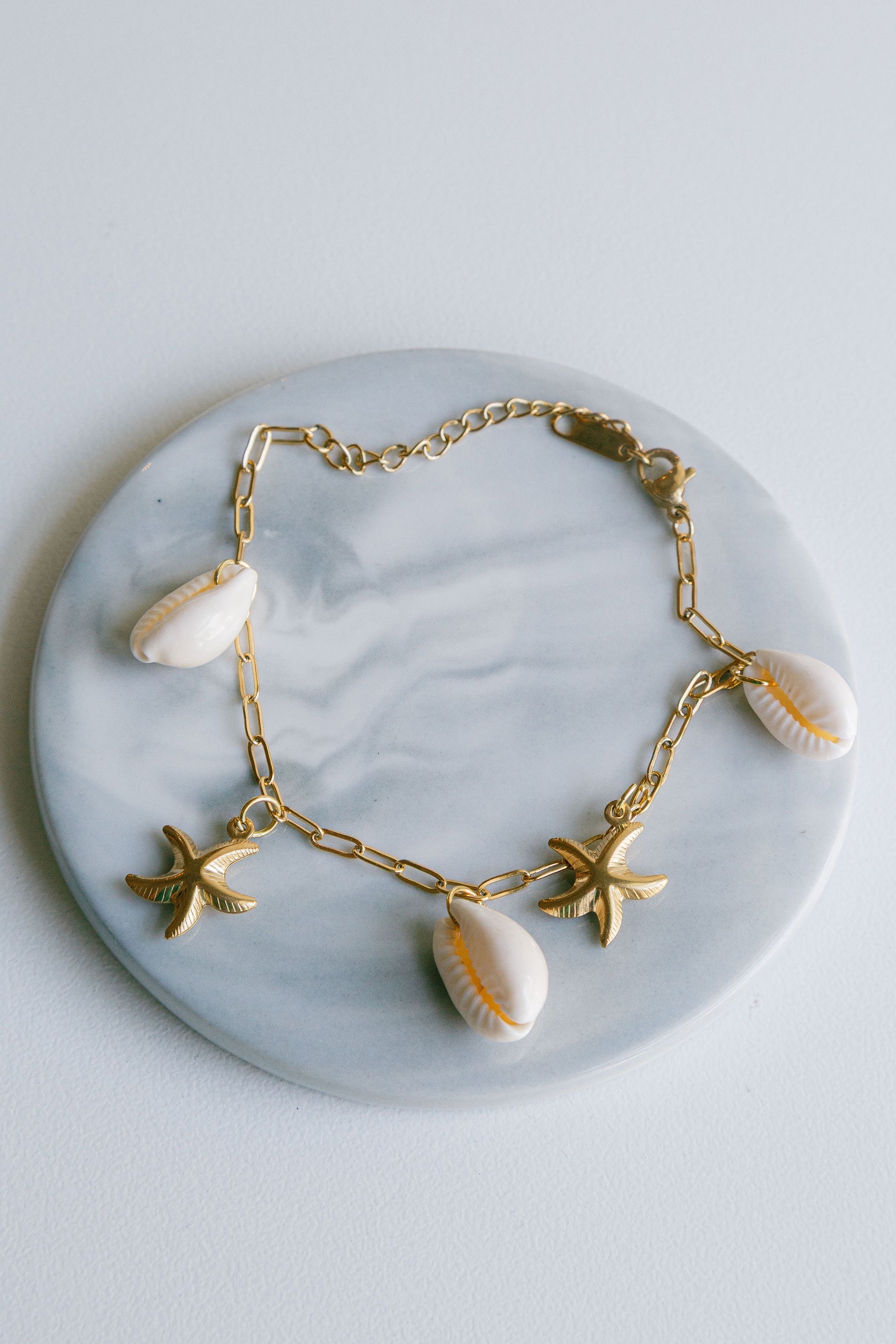 A gold stainless steel necklace with seashells and starfish charms.