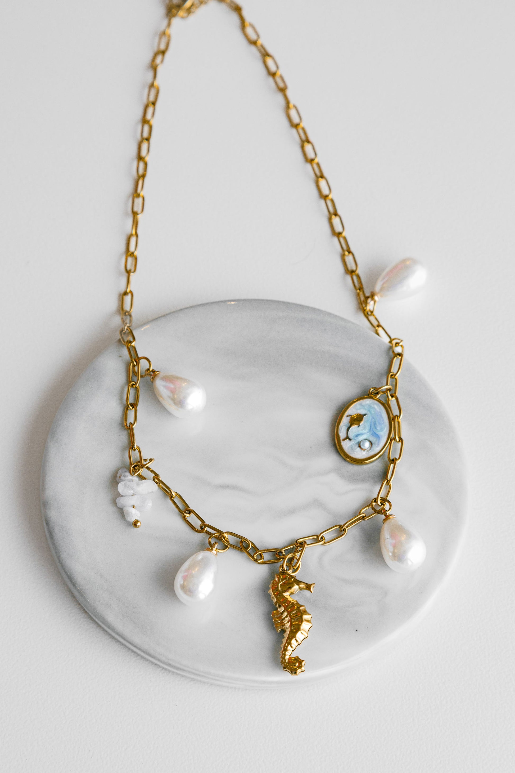 A gold stainless steel necklace with sealife charms. Waterproof and Tarnish free.
