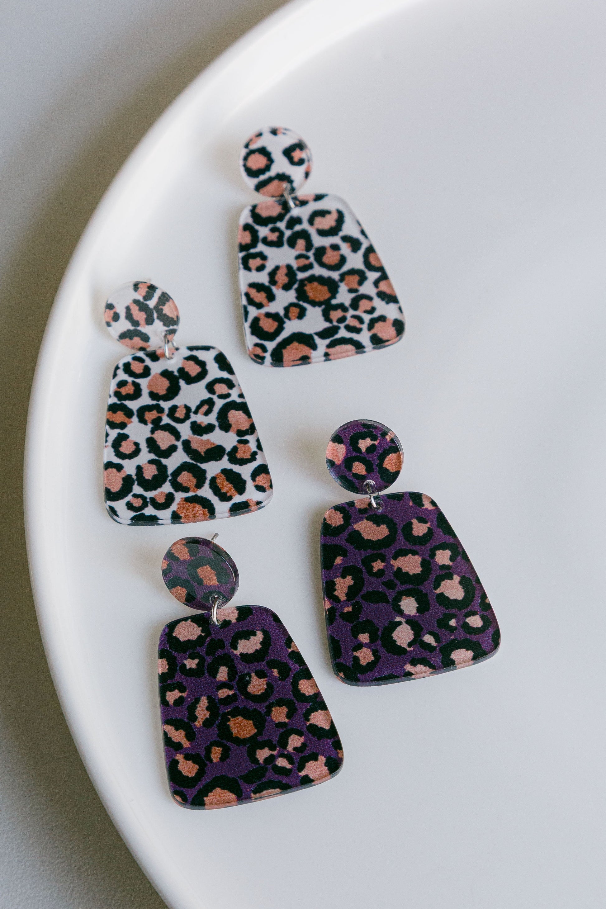 Locally, handmade perspex earrings with a variety of shapes and prints.