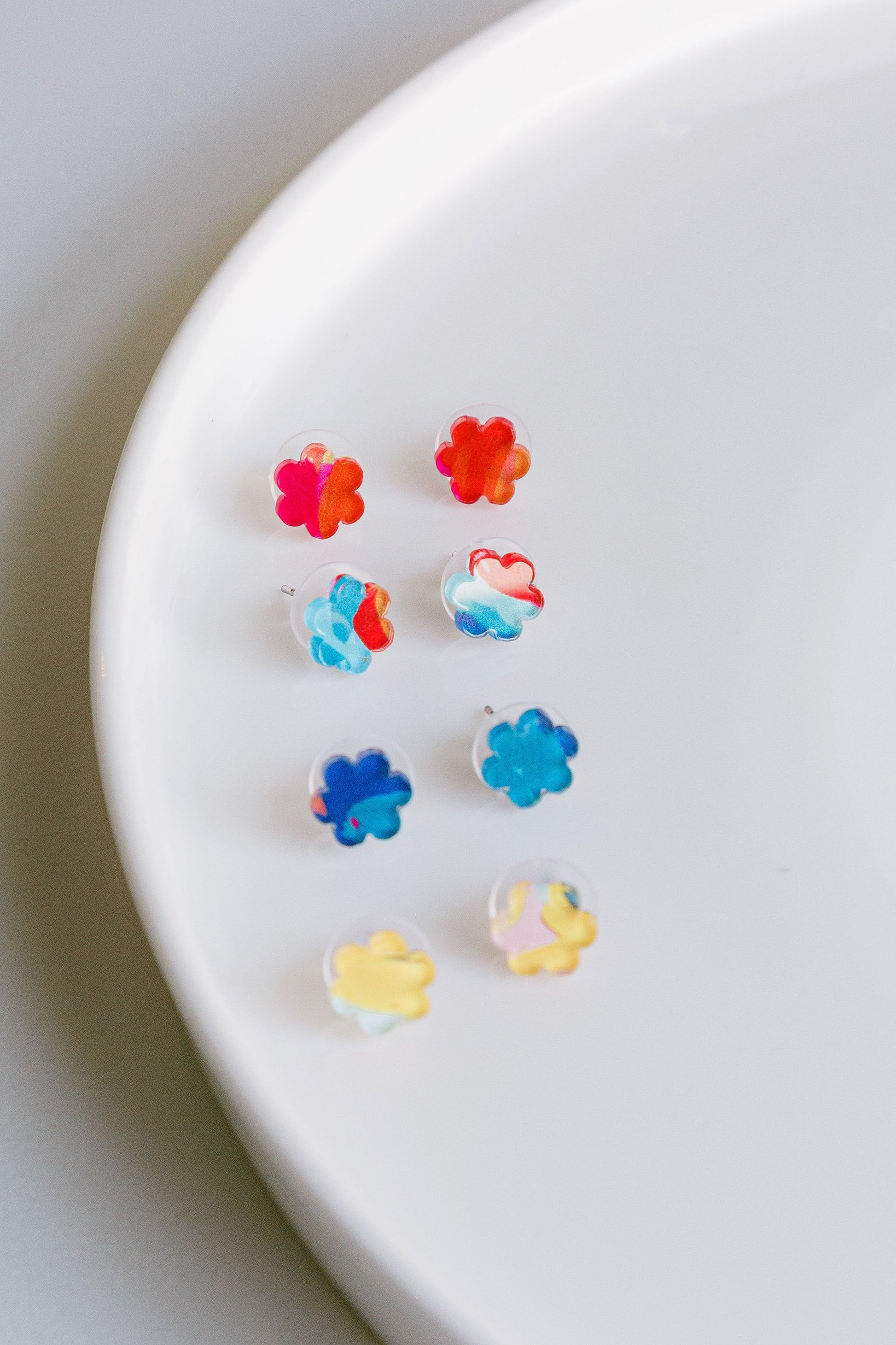 Locally, handmade perspex earrings with a variety of shapes and prints.