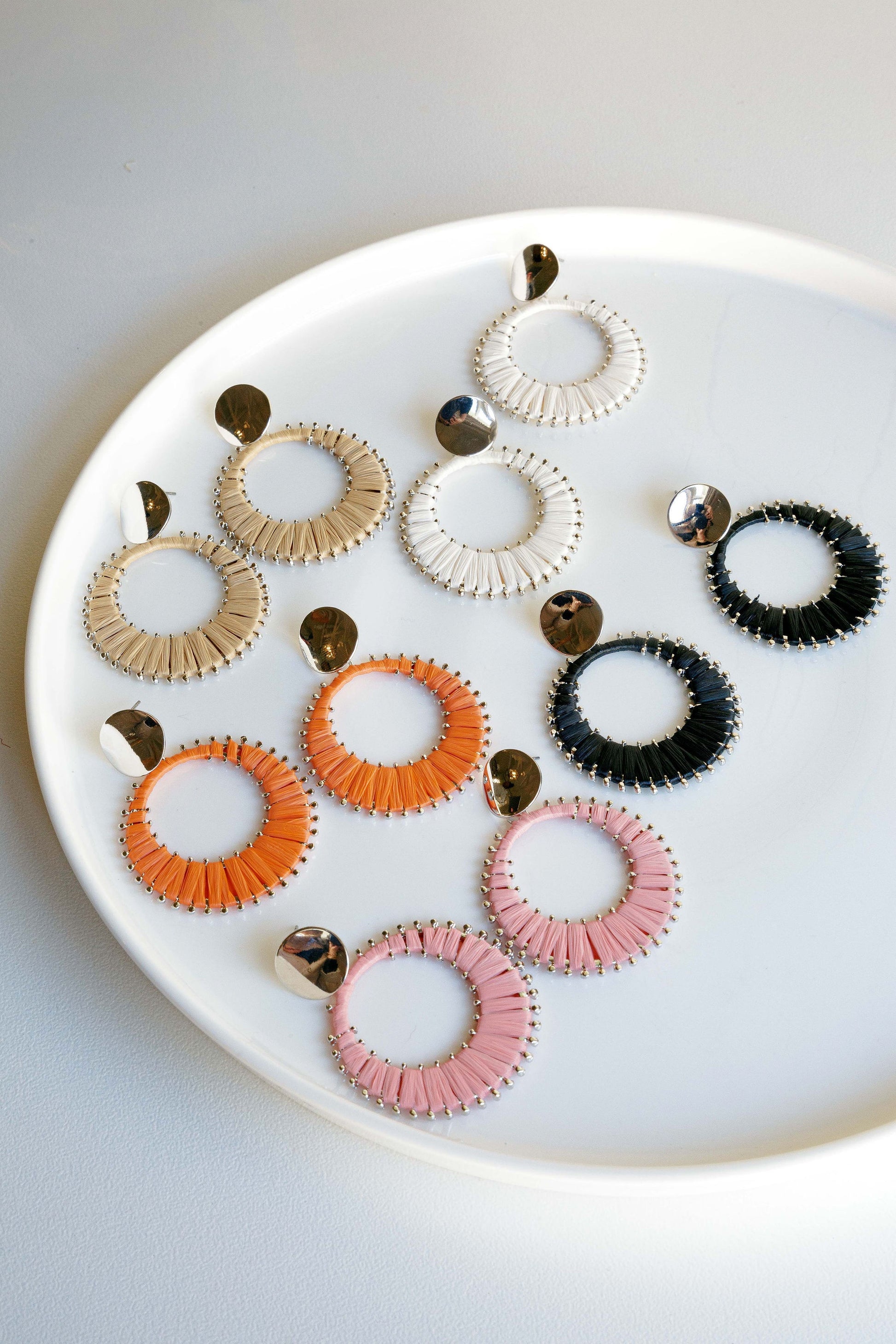 A silver stud earring with a textured raffia cut out circle. Available in black, beige, white, orange and pink and bright pink.