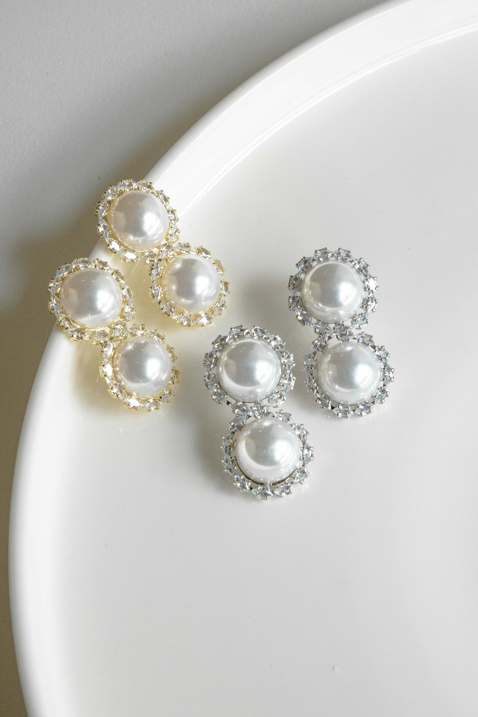 An elegant double faux pearl with diamond rhinestone trimming. Available in silver and gold.