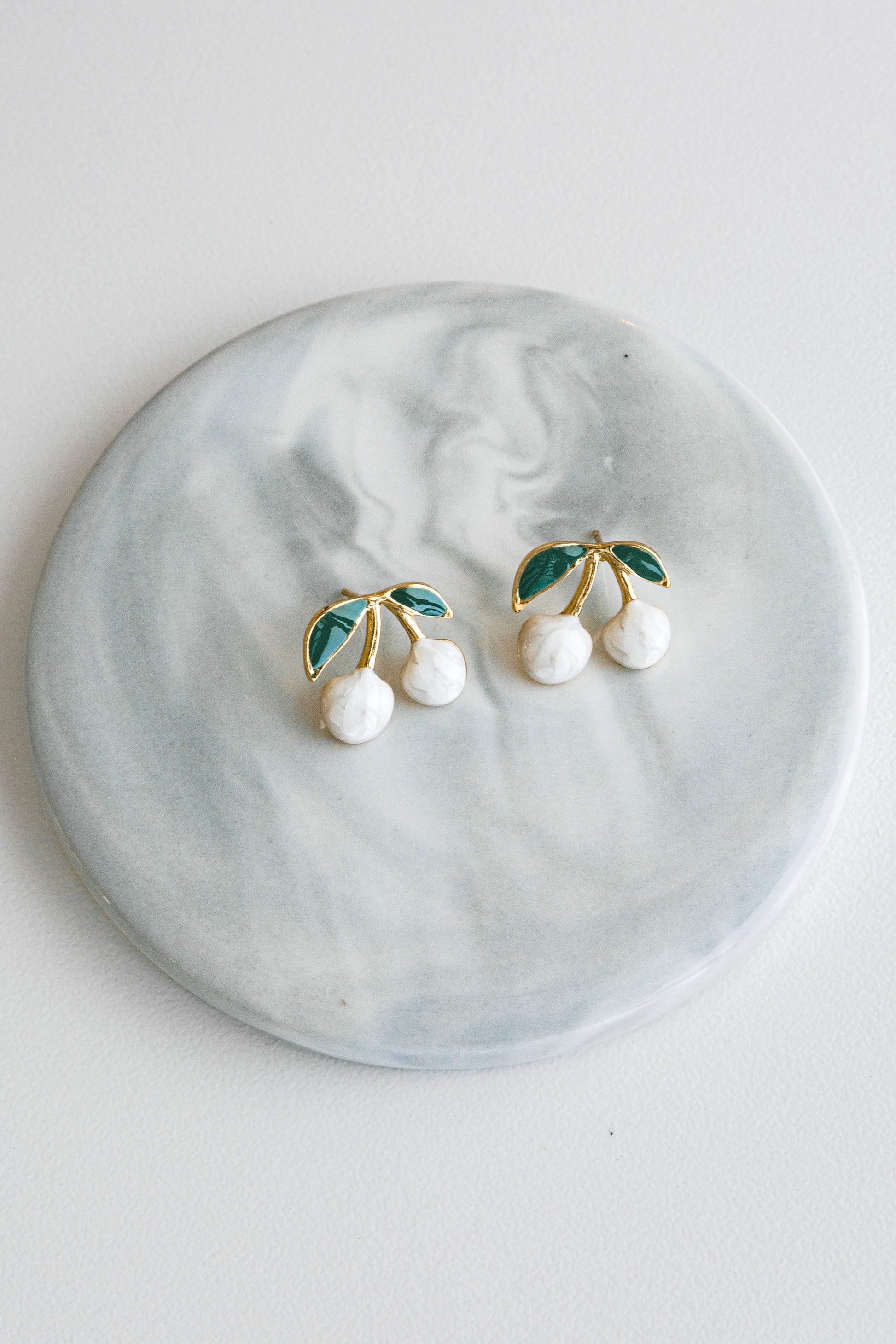 A cherry shaped enamel coated gold stainless steel stud earring.