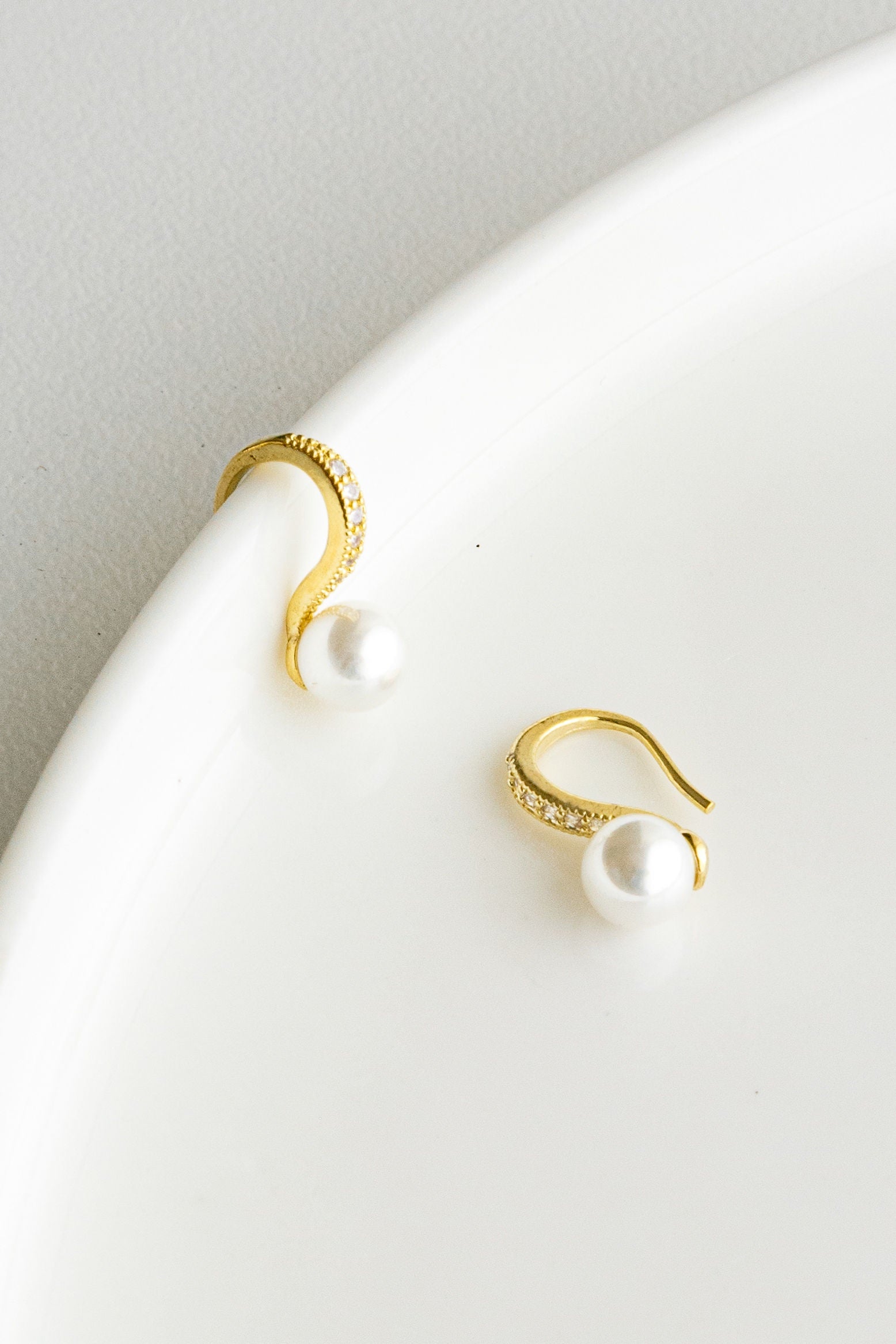 A gold or silver hook earring with pearl drop and diamante detail.