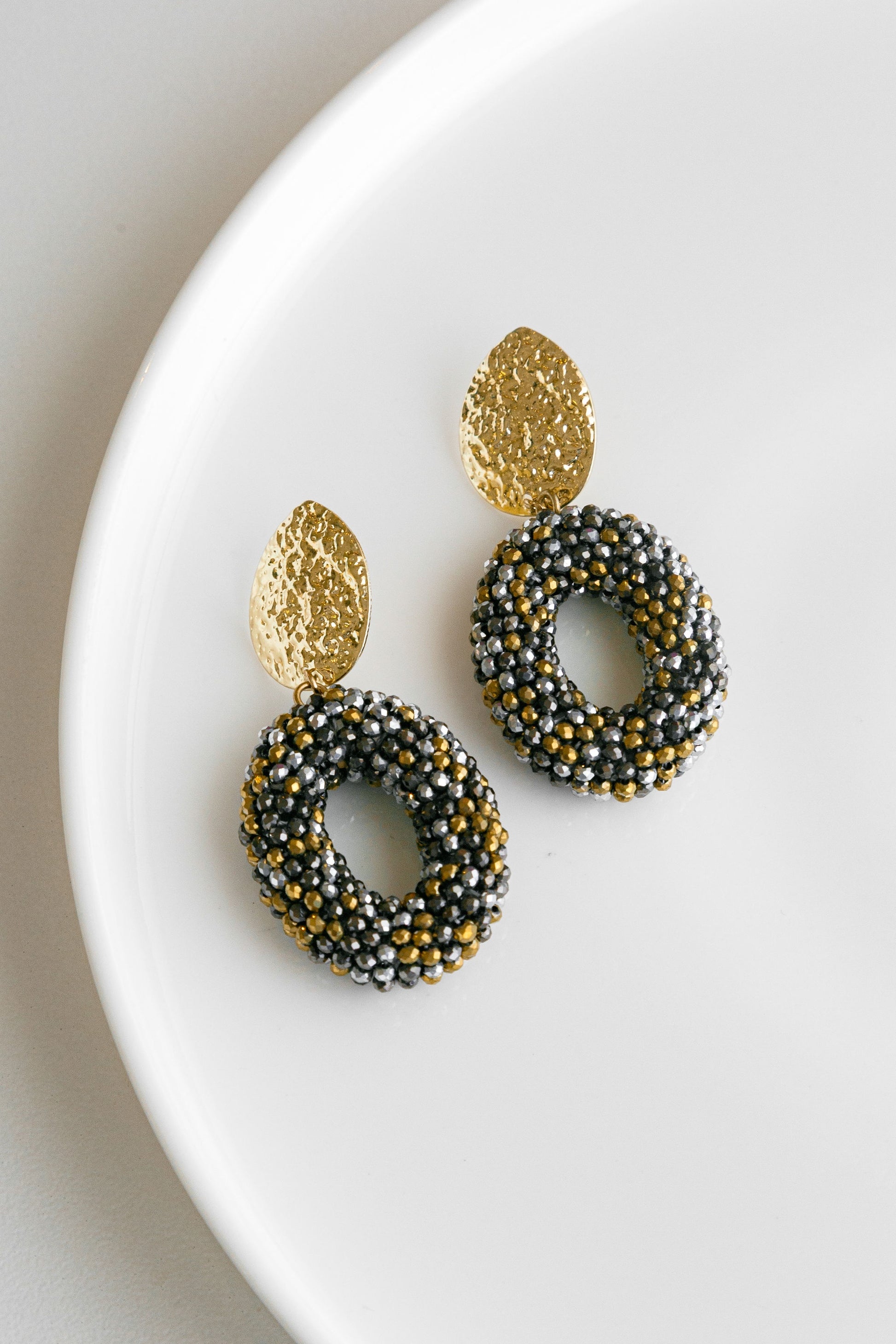 A gold textured disc, stud earring, with metallic beaded hoop.