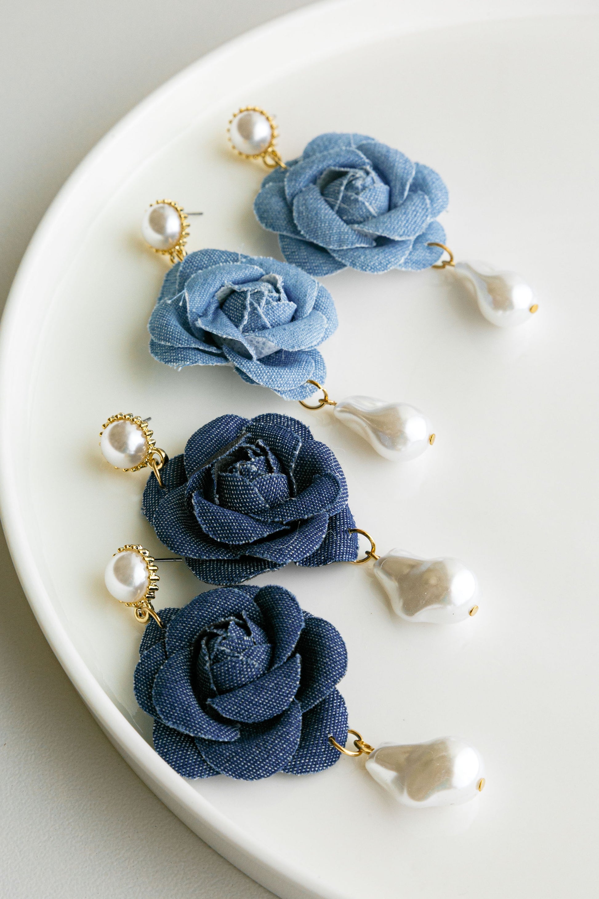 A trendy pearl and denim flower stud earring with gold trimmings. Available in light or dark.